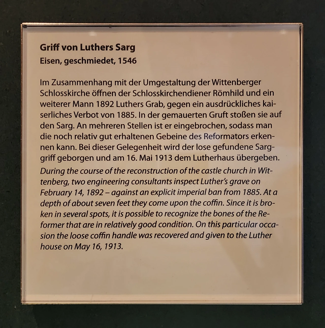 루터의 관 손잡이에 대해서는 다음과 같은 자세한 설명이 덧붙여져 있다: "비텐베르크 성교회의 개축이 행해지고 있던 1892년 2월 14일에 룀힐트(Römhild)와 또 한 명의 엔지니어가 1885년에 발해진 황제의 명을 어기고 루터의 무덤을 열었고, 약 7피트 정도의 깊이에 묻혀 있던 루터의 관과 만나게 되었다. 루터의 관이 여기저기가 부서져 있었기 때문에 그들은 비교적 잘 보존되어 있는 종교개혁가 루터의 유골을 볼 수 있었다. 이때 관에서 분리되어 있는 손잡이가 회수되었고, 그 손잡이는 1913년 5월 16일에 루터의 집에 기증되었다."