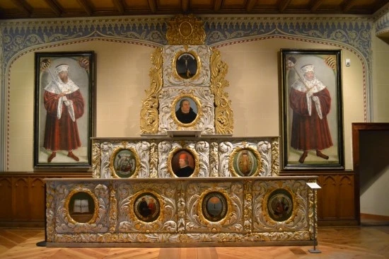 아래의 것은 일단 그 화려함으로 인하여 이것이 전시되어 있는 방에 들어서는 순간 내 눈을 확 잡아 끈 것이었는데, (특히 학술적) 논쟁이 행해지던 강단이다. 맨 밑단은 당시 대학의 4개 학부, 즉 철학, 법학, 의학 그리고 신학을 상징하는 문장(紋章)이라고 한다.