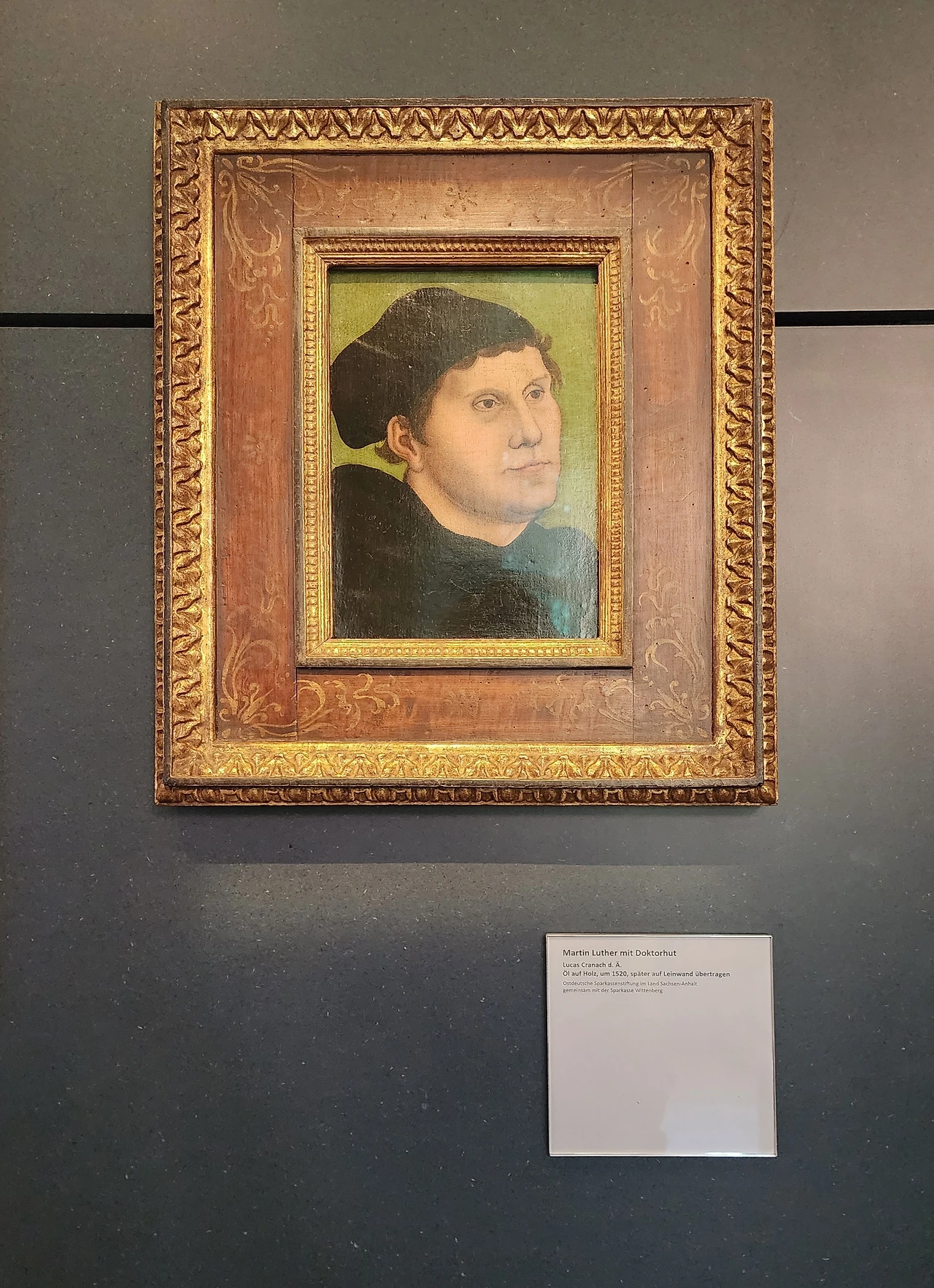 다음으로 아래의 그림은 각종 루터의 초상화 가운데 우리가 가장 자주 많이 만나는 초상화인 '수도복(Kutte)을 입고 있는 루터'이다. 여기서 Kutte는 특히 소매와 옷자락이 길고 두건이 달린 것을 말하는데, 그림 속의 Kutte는 95개조의 반박문을 내건 1517년에 영주에게서 선물 받은 것이라고 한다. 이 또한 크라나하의 작품인데, 나무 위에 오일로 그린 1520년 그림이다. 아, 이 그림은 훗날 캔버스 위로 옮겨졌다.