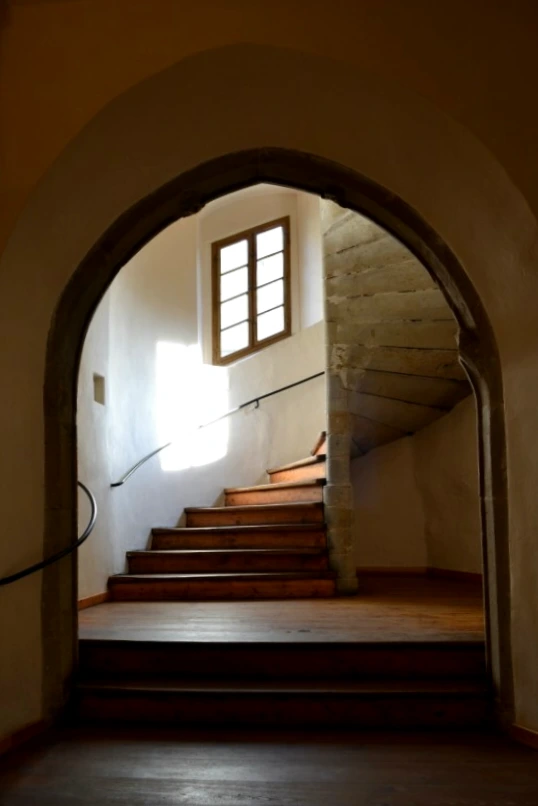 지금까지 본 2점의 그림, 루터의 설교단, 루터의 관 손잡이, 그리고 죽은 루터의 모습을 담은 그림 등의 전시물을 보고 나면 아래 사진과 같은 계단을 통하여 1층(우리 개념으로 말하면 2층)으로 올라가도록 되어 있다.