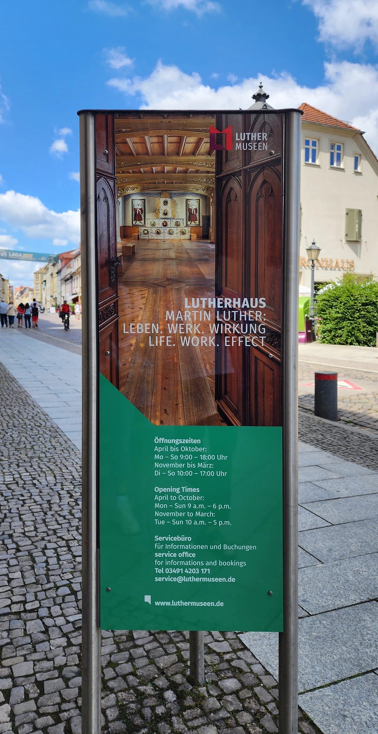 콜레기엔거리를 따라 걷기 시작하면 곧바로 루터의 집을 알리는 커다란 입간판과 마주치게 되는데, 입간판에는 "마틴 루터의 삶과 그의 업적, 그리고 그것이 세상에 미친 영향"이라고 쓰여 있다. 아, 개관시간도도 쓰여 있는데, 그에 따르면 관광객들이 많이 찾는 4월부터 10월까지는 오전 9시부터 오후 6시까지 매일 개관한다. 그러나 상대적으로 찾는 이가 적은 11월부터 3월까지는 월요일에 휴관하며, 개방시간도 오전 10시부터 오후 5시까지로 조금 짧아진다.