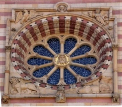 위 사진 속의 조각상 위쪽으로 붉은색의 원으로 둘러싸인 푸른 빛으로 단장한 꽃문양의 창이 보이는데, 주변의 4면에 독수리나 사자 등의 부조가 새겨져 있는 것을 볼 수 있다. 이들은 신약성경 맨 첫머리에 나오는 4복음서의 저자인 마태, 마가, 누가, 요한을 상징하는 것이라고 하는데, 역시 무엇이 어느 분을 상징하는 것인지는 내 알지 못한다.