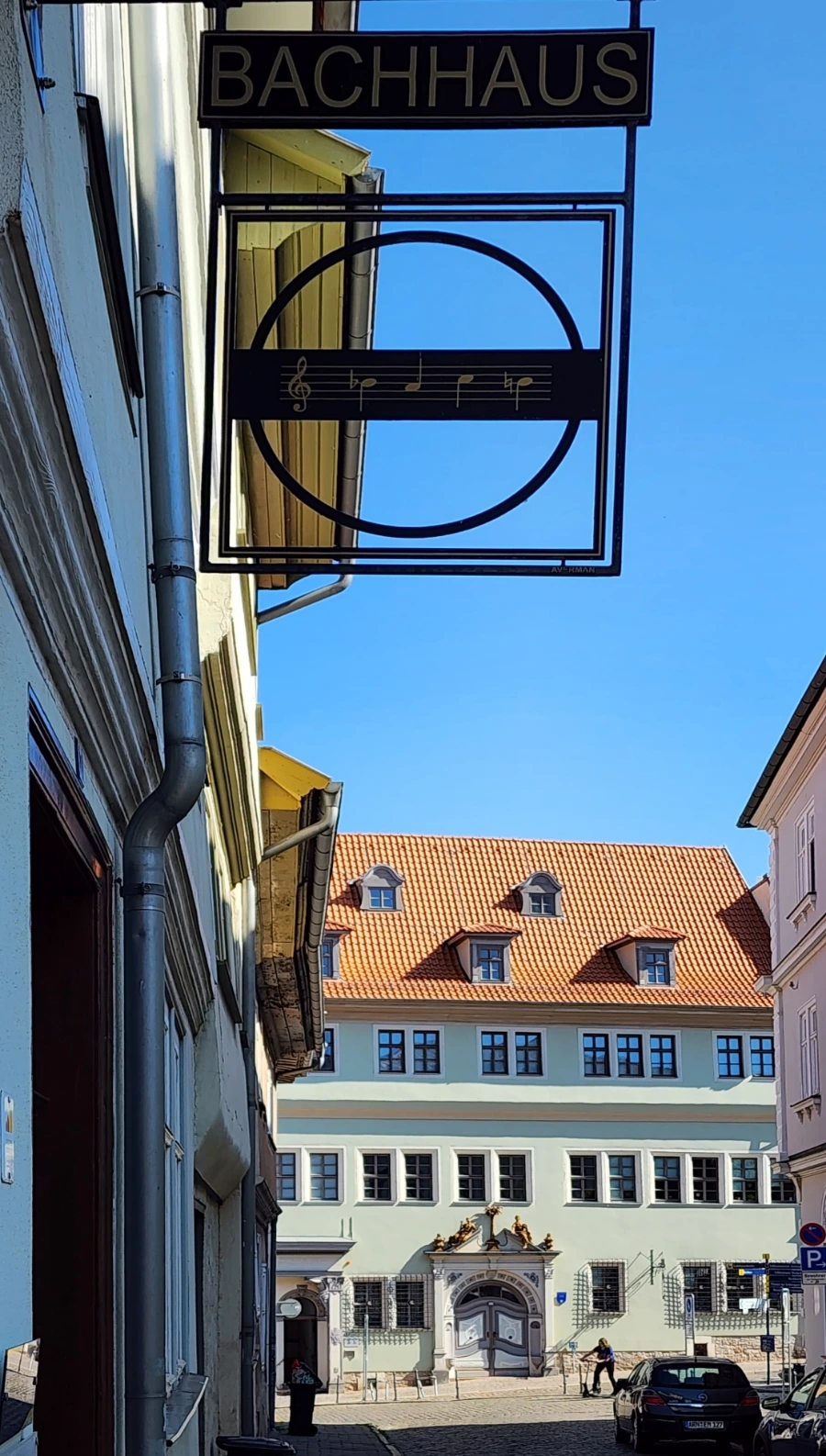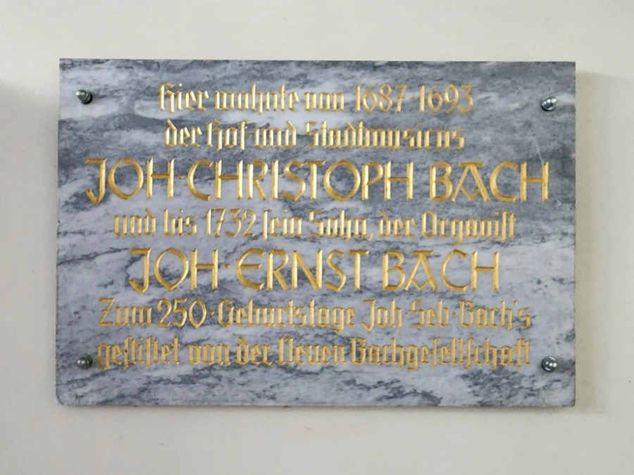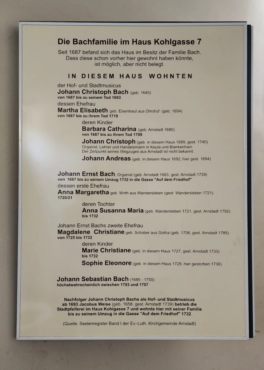 그 옆으로 이 집에 대한 비교적 상세한 정보가 담긴 게시물이 걸려 있는데, 그에 따르면 이 집은 음악가족인 바하네 집안 사람들이 45년간 대대로 살았던 집이었다고 한다. 꼼꼼히 읽어 보니 먼저 이 집에 살았던 것이 분면하고 거주연대가 밝혀진 위의 두사람과 그들의 처, 그리고 그 자식들의 이름이 열거된 다음, 맨밑에 우리가 아는 Johann Sebastian Bach라는 이름이 보인다.