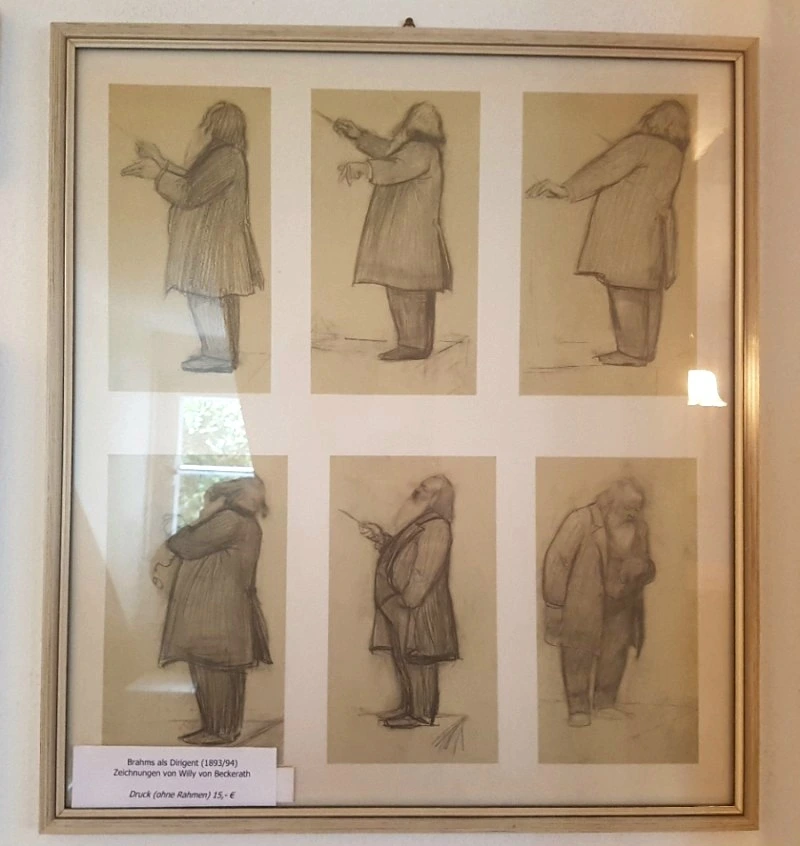브람스하우스의 각종 전시물 중 가장 관심을 가지고 재미있게 본 것인데, 브람스가 지휘자로 활동했던 시절(1893/1894년)의 브람스 모습을 Willy vom Beckerrath란 사람이 간략히 스케치를 한 작품이다. 아, 이 그림은 액자 없이 15유로에 판매하고 있었는데(2018년 8월), 괜스레 번거로울 것 같아 그냥 돌아섰다. 지금 이 글을 쓰고 있자니 눈에 밟힌다.