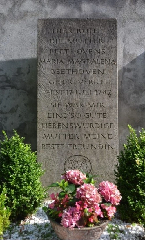 비록 베토벤 어머니의 묘 자체는 초라한 모습을 하고 있지만, 분홍색 꽃 뒤편의 묘지석에 적힌 말은 참 감동적이었다. 하여 몇 번씩이나 다시 읽어 보았는데, 그곳에는 "여기에 베토벤의 어머니, 마리아 막달레나 베토벤이 영원한 휴식을 취하고 있다. (베토벤이 한 말인지는 모르겠다만) 그녀는 나의 사랑스러운 어머니이자 최고의 여자친구였다"라는 적혀 있었다. 아, 베토벤 어머니의 결혼 전의 성(姓)은 케베리히(Kevereich)이었네. 유럽의 다른 나라들과 마찬가지로 독일 또한 결혼을 하면 남편 성을 따르게 되어 있는데, 베토벤 어머니의 묘지석에서 보듯이 사망을 하게 되면 묘지석에 결혼 전의 성을 밝혀 놓는 경우가 많다.