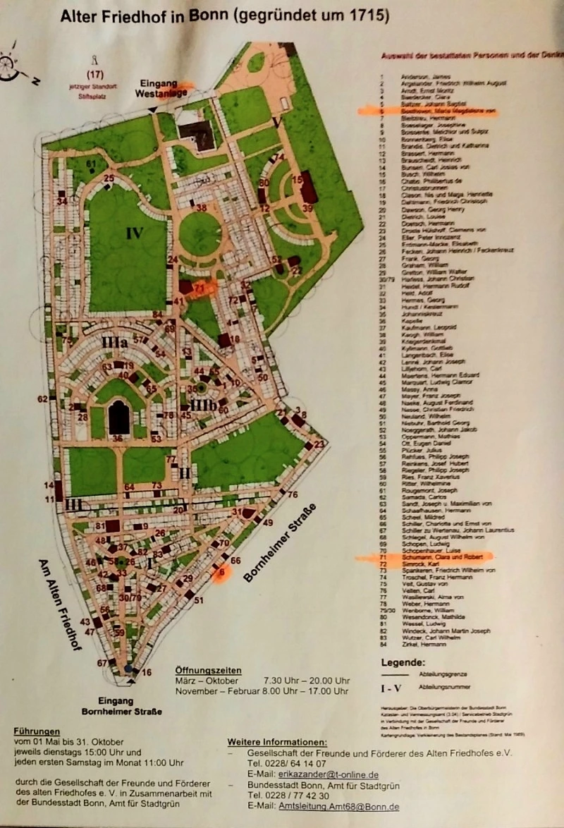 이처럼 베토벤의 묘지는 (그의 생가와 함께) 잘 보존되어 있고, 여전히 많은 찾는 사람들이 찾고 있다. 그리고 묘지 앞에는 이들이 가져다 놓은 꽃들이 언제나 그득하다. 그런데 이처럼 베토벤을 훌륭한 음악가로 키워낸 베토벤 부모님의 경우에는 - 내가 알고 있는 한 - 단지 베토벤 어머니의 묘만 확실하게 보존되어 있는데, 베토벤 어머니의 묘를 만날 수 있는 곳은 본 외곽에 있는 "구 묘지(Alter Friedhof)"이다. 본의 구 묘지는 1715년에 조성된 것으로, 아래 사진에서 보듯이 넓은 구역에 많은 묘가 들어서 있다. 때문에 베토벤 어머니의 묘를 찾아가기 위해서는 아래 사진과 같은 지도의 도움이 반드시 필요하다. 우선 구 묘지의 출입구는 지도 위쪽에 독일어로 Eingang이라고 쓰여 있는 부분이다. 그리고 베토벤 어머니의 표는 지도 가장 아래쪽에 형광펜으로 표시되어 있는 곳(지도상의 6번)이다. 아, 구 묘지 중앙에 있는 71번에도 형광펜으로 표시가 되어 있는 것이 보일터인데, 그에 대해서는 나중에 간단히 따로 이야기하도록 하겠다.