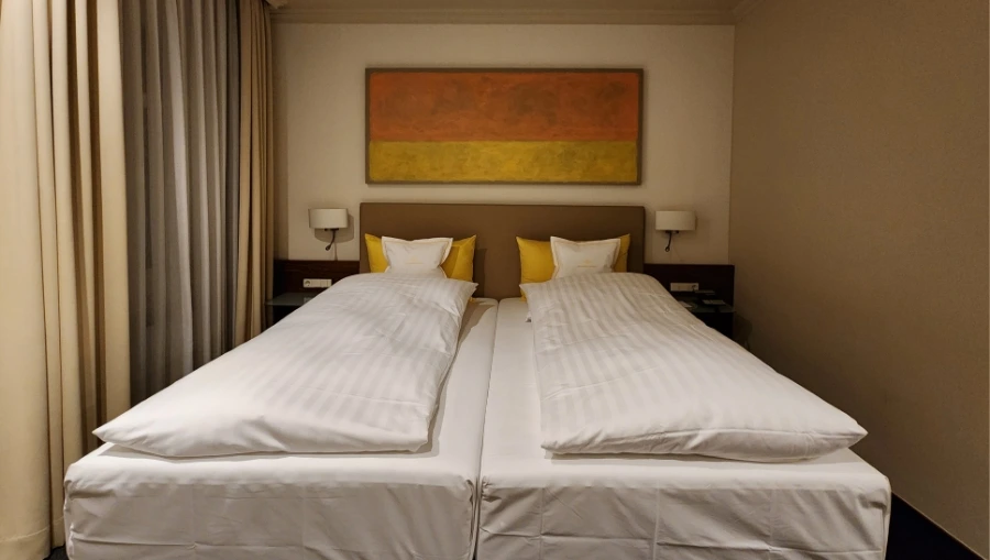 객실 내부의 모습인데, 베드는 그저 그런 수준이다. 웰컴 드링크도 알량한 크기의 물 한병에 그치고 있고