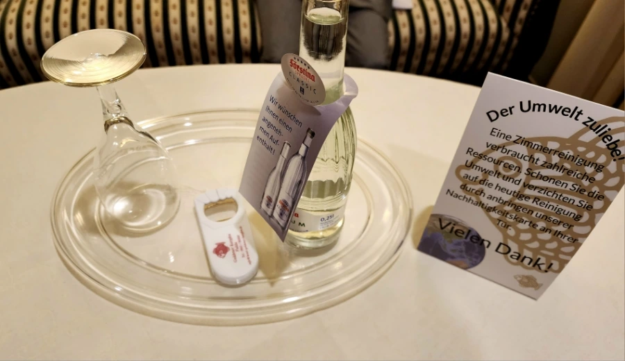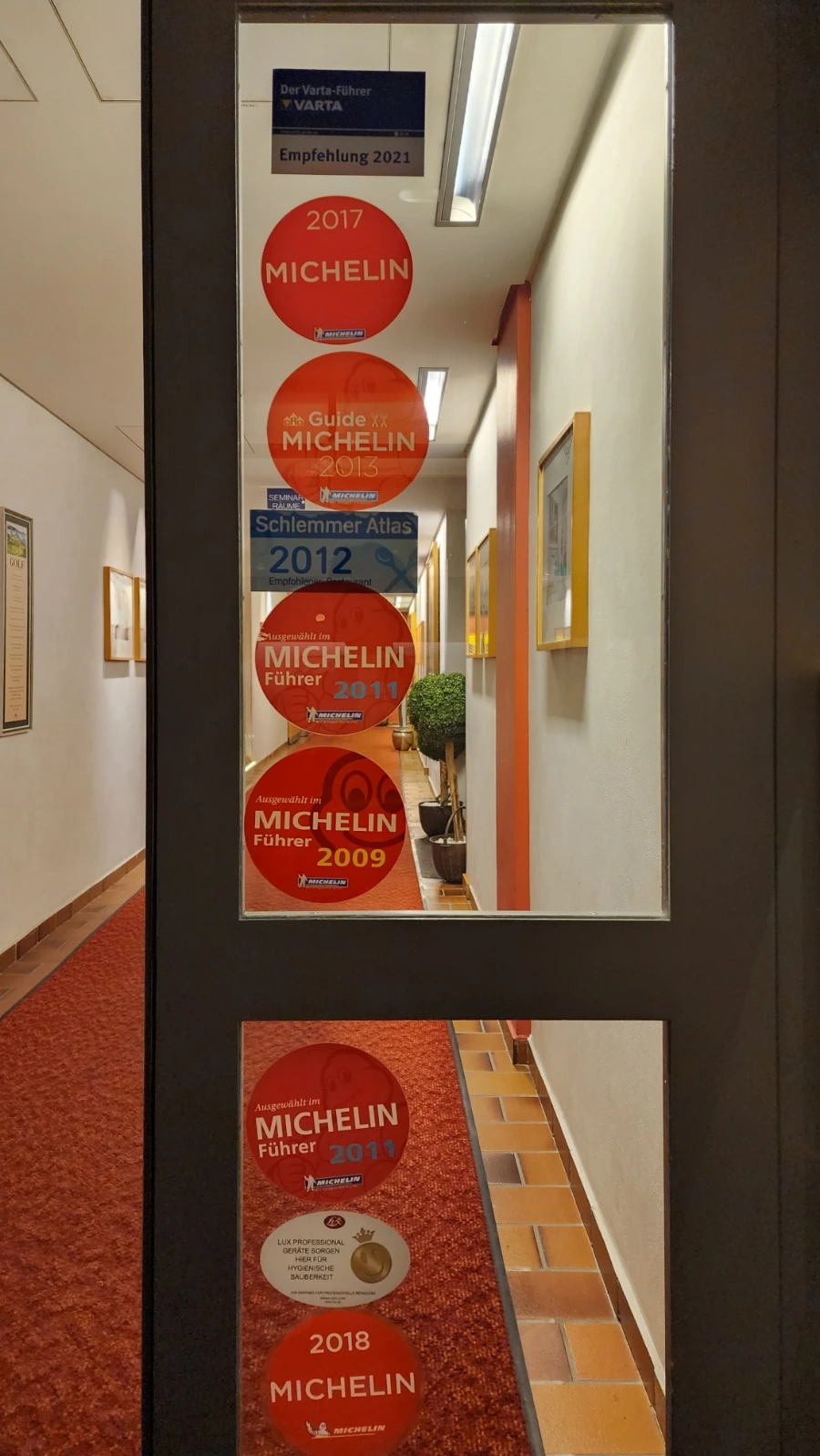 위 사진속의 잉어가 가리키는 방향을 따라가면, 호텔로 들어가는 문이 나온다. 문에 좀 지저분해 보일 정도로 무언가가 붙어 있는데, 이 호텔의 레스토랑이 미슐랭이 선정한 곳이라는 표지들이다. 뒤에 다시 이야기하겠지만, Hotel Goldener Karpfen의 레스토랑은 아주 괜찮은 편이다. 혹시 이 곳에 묵는다면 어줍잖은 레스토랑을 찾아 헤매지 말고, 이곳에서 식사를 할 것을 권하고 싶을 정도로.