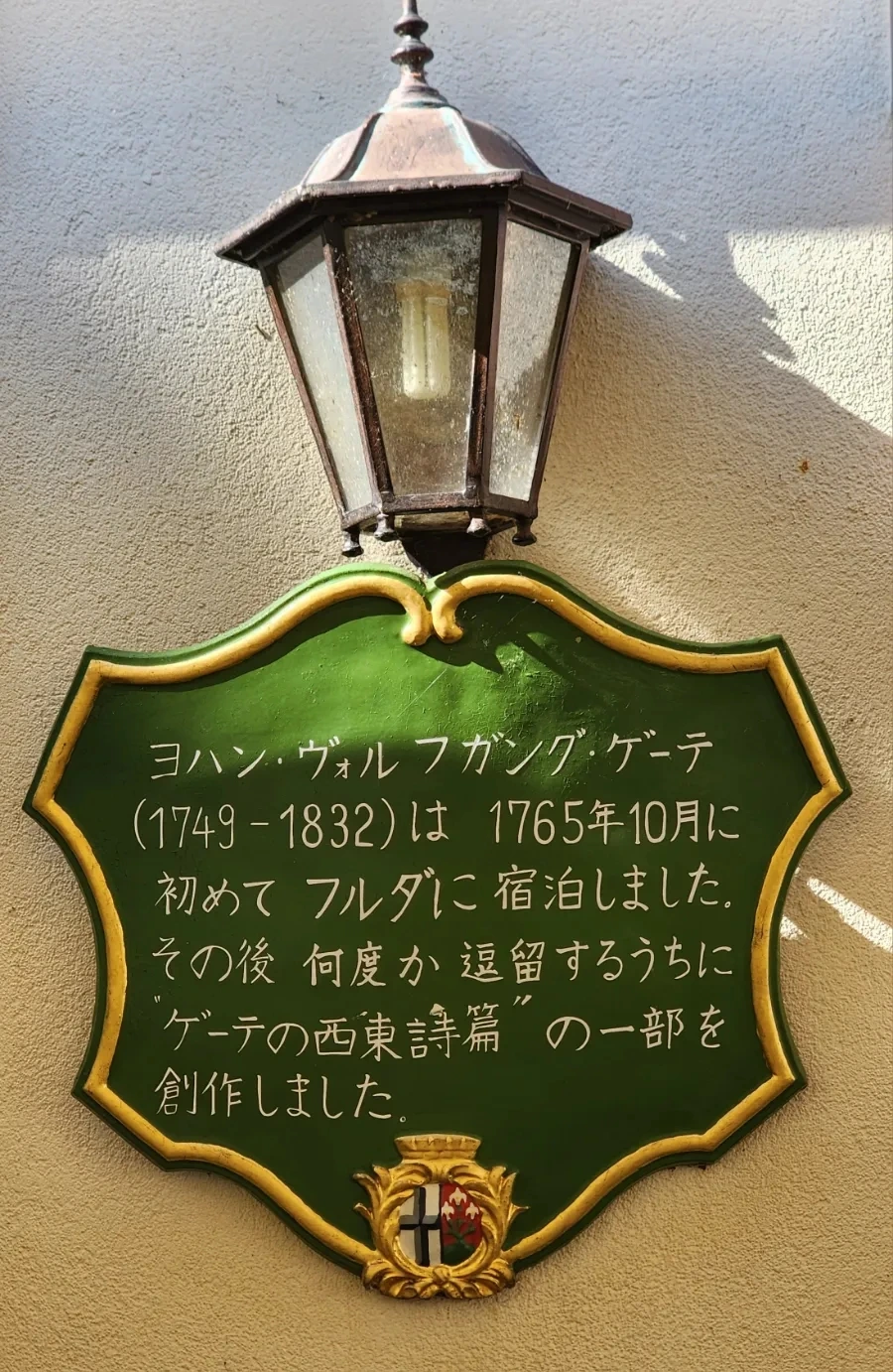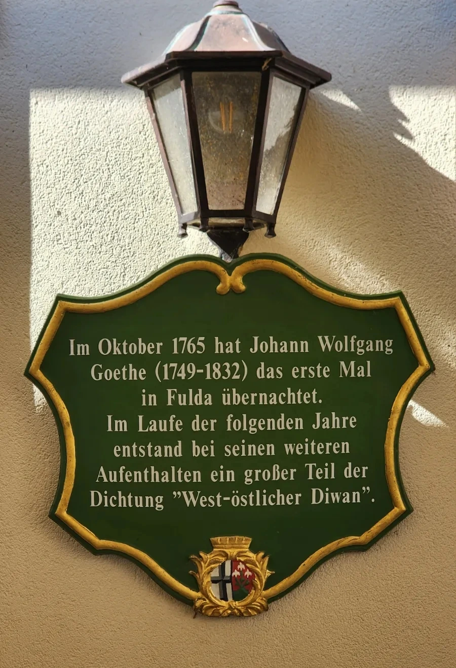 독일의 대문호 괴테(Johann Wolfgang von Goethe, 1749~1832)는 프랑크푸르트(Frankfurt)에서 태어났지만 그가 문학가이자 정치가로 활발하게 활동한 곳은 바이마르(Weimar)였다. 이 때문에 괴테는 프랑크푸르트와 바이마르를 자주 오갔는데, 문제는 이 두곳이 약 270km나 떨어져 있기 때문에 당시 교통사정상 하루에 오갈 수 없었다. 하여 괴테는 푸랑크푸르트와 바이마르를 오갈 때면 그 중간쯤 되는 풀다(Fulda)에서 하루를 유했는데, 이 때 괴테가 머물렀던 호텔이 바로 "Hotel Goldener Karpfen(황금잉어 호텔)"이다. 기록에 의하면 괴테는 1765년 10월에 이곳에서 처음으로 숙박을 한 이후부터 프랑크푸르트와 바이마르를 오갈 때면 으레 이곳에서 머물렀다고 한다. 뿐만 아니라 괴테는 이곳에 머물면서 서동시집(西東詩集, West-östlicher Diwan)에 실린 시의 대부분을 지었다고 하는데, Hotel Goldener Karpfen의 외벽에 는이런 내용이 적혀 있는 안내판이 붙어 있다.