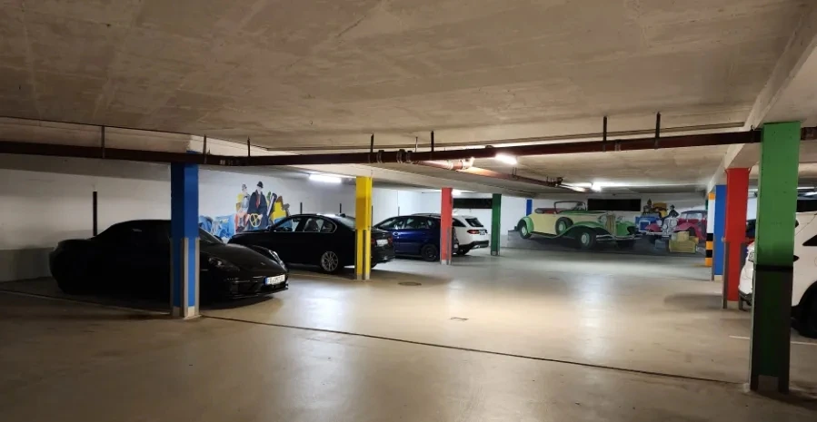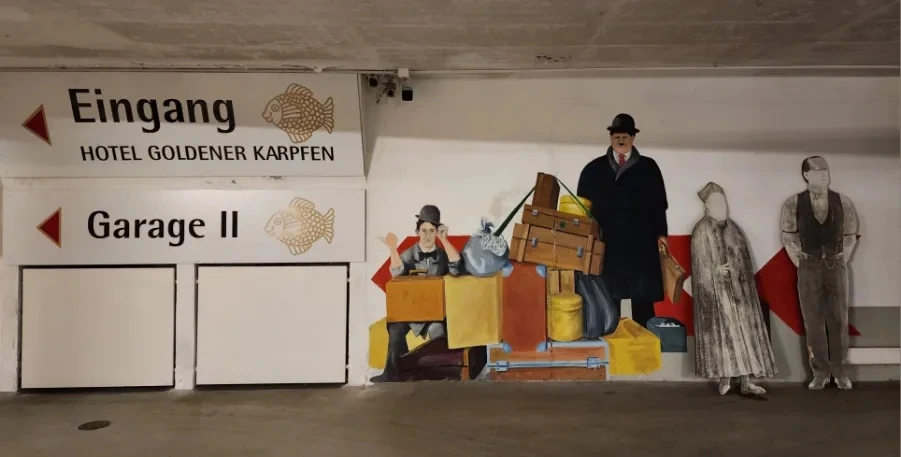 지하 주차장은 조금 어둑한 곳으로 방치해 놓기 쉬운데, Hotel Goldener Karpfen의 경우는 주차장에 벽화(?)를 그려놓고 밝은 조명을 설치해 놓은 것이 특징적이다. 아래 사진속 벽화 외에도 귀여운 벽화들이 주차장 벽면을 가득 메우고 있지만 생략하기로 한다.