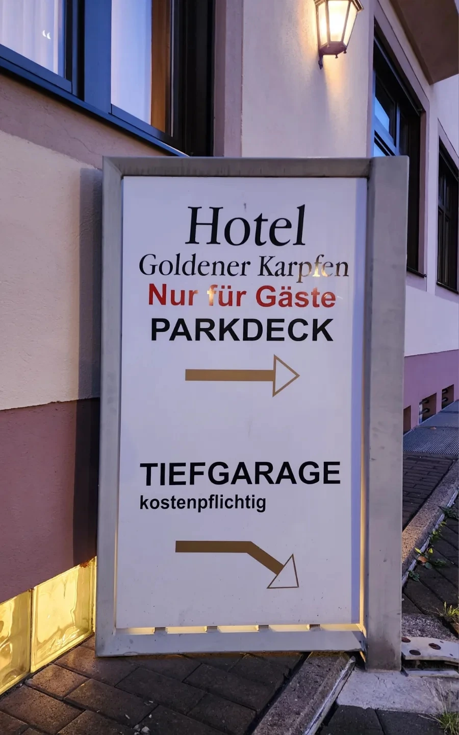 유럽의 구시가지에 있는 호텔의 경우 주차문제가 여의치않은 경우가 있는데, Hotel Goldener Karpfen은 호텔 손님만을 위한 지상의 주차공간(무료)과 주차요금을 납부하여야 하는 지하주차장(유료)... 이렇게 두곳의 자체 주차장을 갖고 있어 주차문제는 신경쓸 것이 전혀 없다.