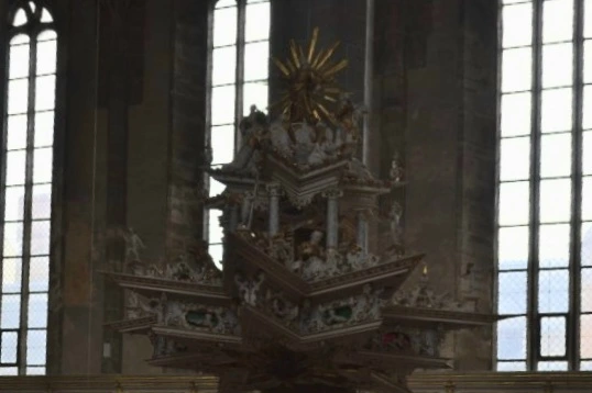 다시 중앙 제단 쪽으로 조금 더 걸어 나와 교회의 전면을 찍은 것인데, 제단 위쪽에 자그마한 오르간이 보이;ㄴ다. 라이헬(Georg Reichel)이란 오르간 마이스터가 1664년에 제작한 오르간인데, 당신의 작품가운데 유일하게 남아있는 오르간으로는 이것이 유일하다고 한다. 아, 교회 측에서는 이 오르간을 공식적으로 (교회 후면에 있는 커다란 오르간과 구분해서) '작은 오르간(Die kleine Orgel)'이라고 부르고 있다.