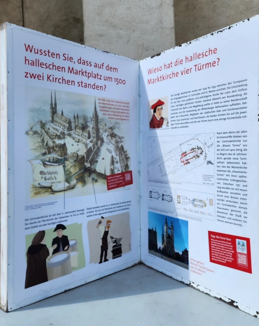 먼저 오른쪽에는 "어찌하여 마르크트교회는 4개의 첨탑을 가지게 되었는가?"라는 질문이 쓰여 있고, 왼쪽에는 "1500년에는 마르크트플라츠에는 두 개의 교회가 있었다는 것을 아십니까?"라는 질문을 통해 그 이유를 설명하고 있다: "옛날에는 동쪽(마르크트플라츠 쪽)에 2개의 첨탑을 가진 성 마리엔교회(St. Marienkirche)가 있었고, 그 옆에 그와 마주 보며 역시 2개의 첨탑을 가진 성 게트루덴교회(St. Getrudenkirche)가 있었다. 그러다가 1529년부터 1554년까지의 공사를 통해 두 개의 교회가 합쳐진 지금의 마르크트교회가 생겨났다. 그리고 이것이 마르크트교회가 지금처럼 4개의 첨탑을 갖게 된 이유이다."라고 되어 있다. 그리고 왼쪽 전시물에 두 개의 교회가 독립해서 존재하던 시절의 모습을 보여주는 그림을 그려 놓았다.