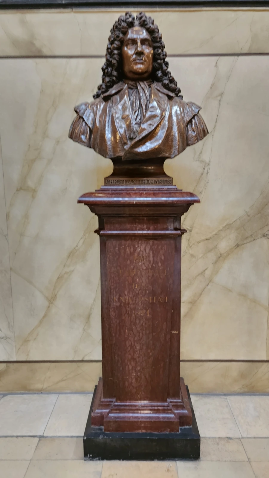 1층으로 오르는 계단에서 말로만 듣던 법학자이자 철학자인 토마지우스(Christian Thomasius, 1655~1728)를 만났다. 라이프치히 대학 교수였던 아버지를 통해 휴고 그로티우스(Hugo Grotius, 1583~1645)와 사무엘 푸펜도로프(Samuel Pufendorf, 1632~1694)의 정치철학에 영향을 받은 그는 프랑크푸르트(Frankfurt am Oder) 대학에서 법학을 전공하고, 라이프치히 대학에서 교수로서의 삶을 시작했다. 그러나 신학과 법학에서 전통적인 견해에 대한 과감한 공격을 펼치고(중혼 허용 등), 라틴어 대신 독일어로 강의를 하다가 1690년 5월 설교와 저작을 금지당한다. 이어 자신에 대한 체포명령이 떨어지자 베를린으로 탈출하는데, 프리드리히 선제후는 그에게 할레에 피난처를 제공했다. 할레에서 그는 할레대학의 설립을 도왔고, 1710년에는 대학의 총장에 오르게 된다.