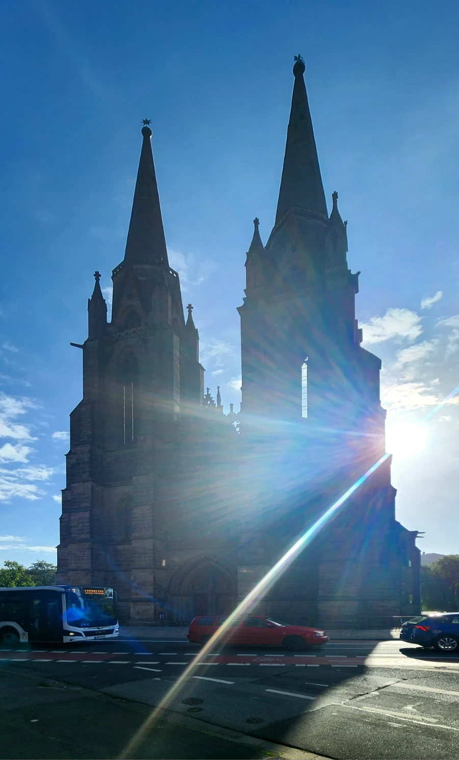 그리고 이것은 서쪽에서 바라본 엘리자베스교회인데, 아침 8시에 빵과 우유를 사러 나왔다가 찍은 사진이다. 때문에 태양을 정면으로 바라보게 되어 정작 교회의 모습은 흐릿하다.