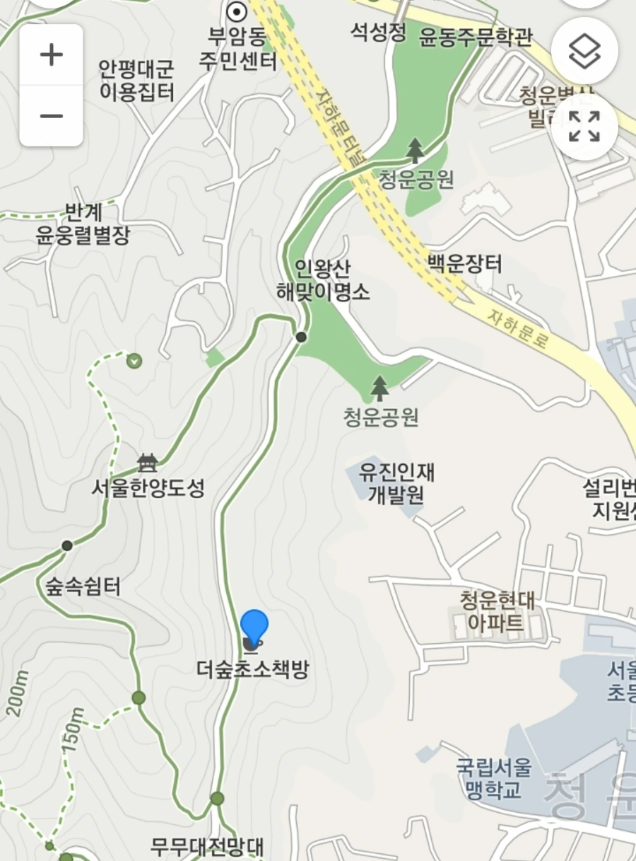이런, 내 스스로 내 이야기에 정신이 팔려 막상 위치를 이야기하는 것을 깜박했다. 우선 주소는 종로구 인왕산 172이고, 지도로 보여주면 이렇게 된다. 해질 무렵의 경치가 압권인 무무대 전망대, 인왕3분초를 리모델링한 '숲속 쉼터'가 지척이고, 윤동주 문학관도 그리 멀지 않은 곳에 있다. 하루쯤 시간을을 충분히 가지고 이들을 연계하여 둘러보면 좋을 듯하다.