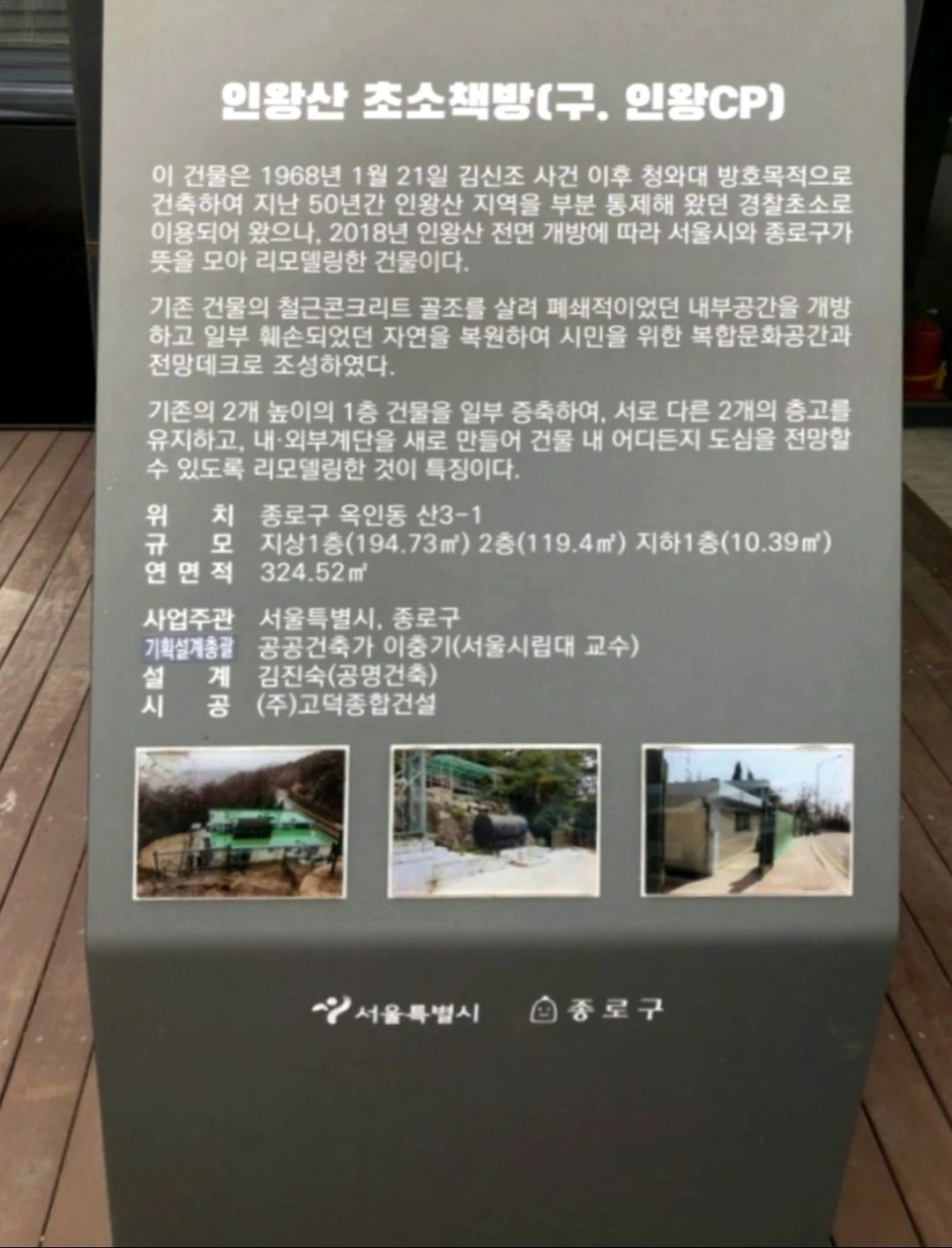 아, 구 인왕CP가 독서카페 "초소책방 더숲"으로 변신해가는 과정에 대하여는 카페 앞에 옛날 사진과 함께 간단하게나마 입간판의 형식을 빌어 설명을 하고 있다.