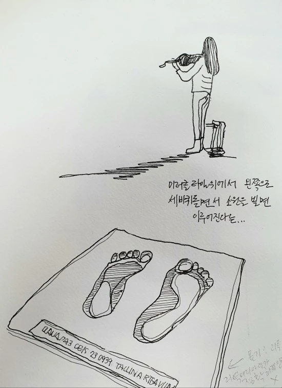 발트 3국을 돌아다니던 시절에는 이상하게도 리가(Riga)나 탈린(Talin)에도 이러한 곳이 있을 것이란 생각을 전혀 못했다. 그런데 이 글을 쓰면서 비로소 "혹시 리가나 탈린에도 이런 곳이 있지 않을까?"라는 의문이 들어 인터넷 검색을 해보았는데, 그 결과 라트비아의 리가에 같은 의미를 담은 표지석이 담겨 있는 사진(chosen.com 참조)을 찾을 수 있었다. 그 이미지는 아래 삽화를 통해 알 수 있을 것이다(아. 이번 연재의 글에 자주 등장하게 될 삽화는 Urban Sketcher 정상숙 님의 그림이라는 것을 밝혀 둔다).