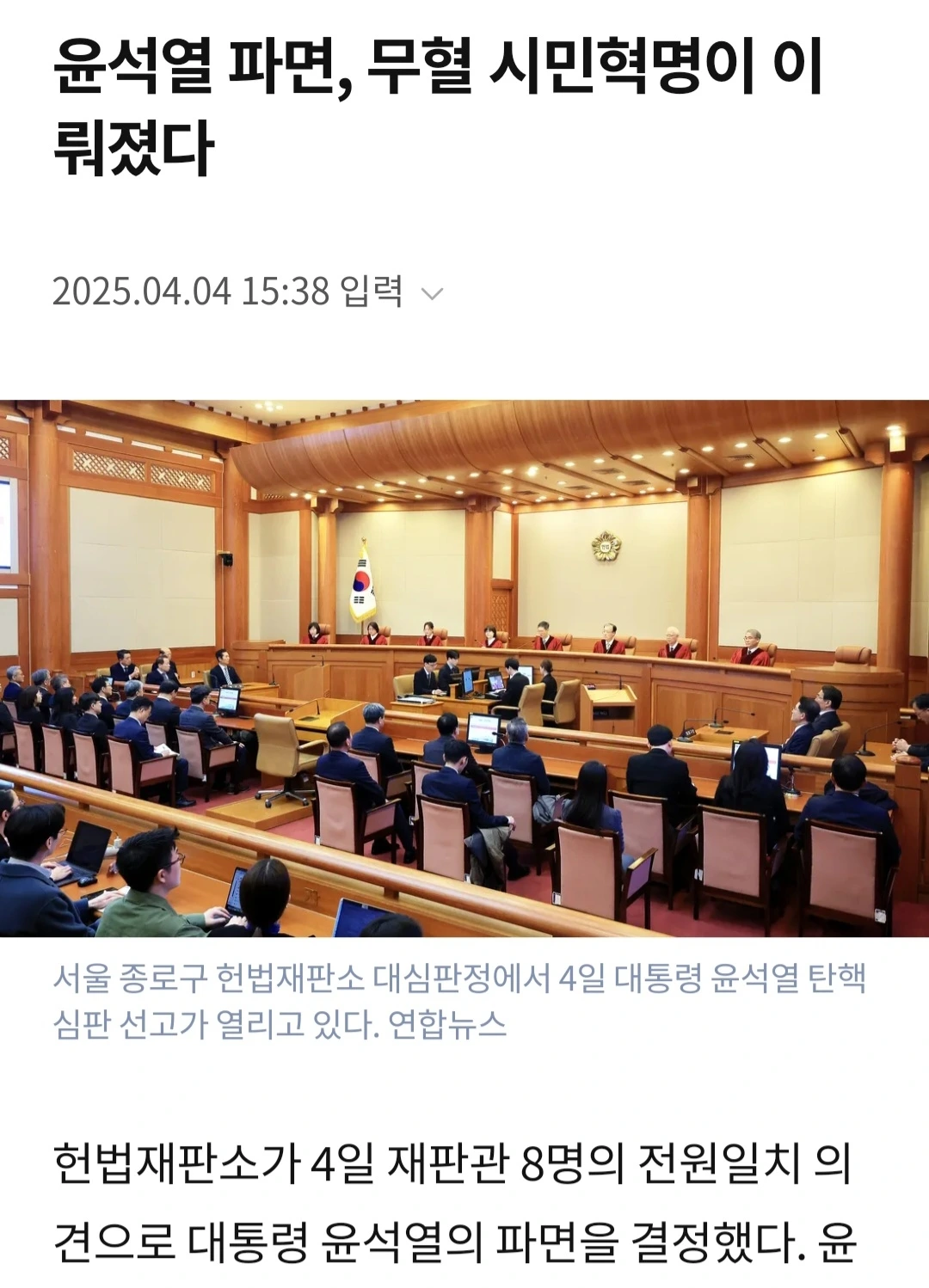 드디어 대통령 탄핵심판이 확정됐다. 아주 쾌거다. 신문은 이 기사를 대서특필했다. 위헌, 위법으로 이루어진 비상계엄. 그 계엄으로 여야대표, 전직 대법원장, 대법관을 체포 시도했다.