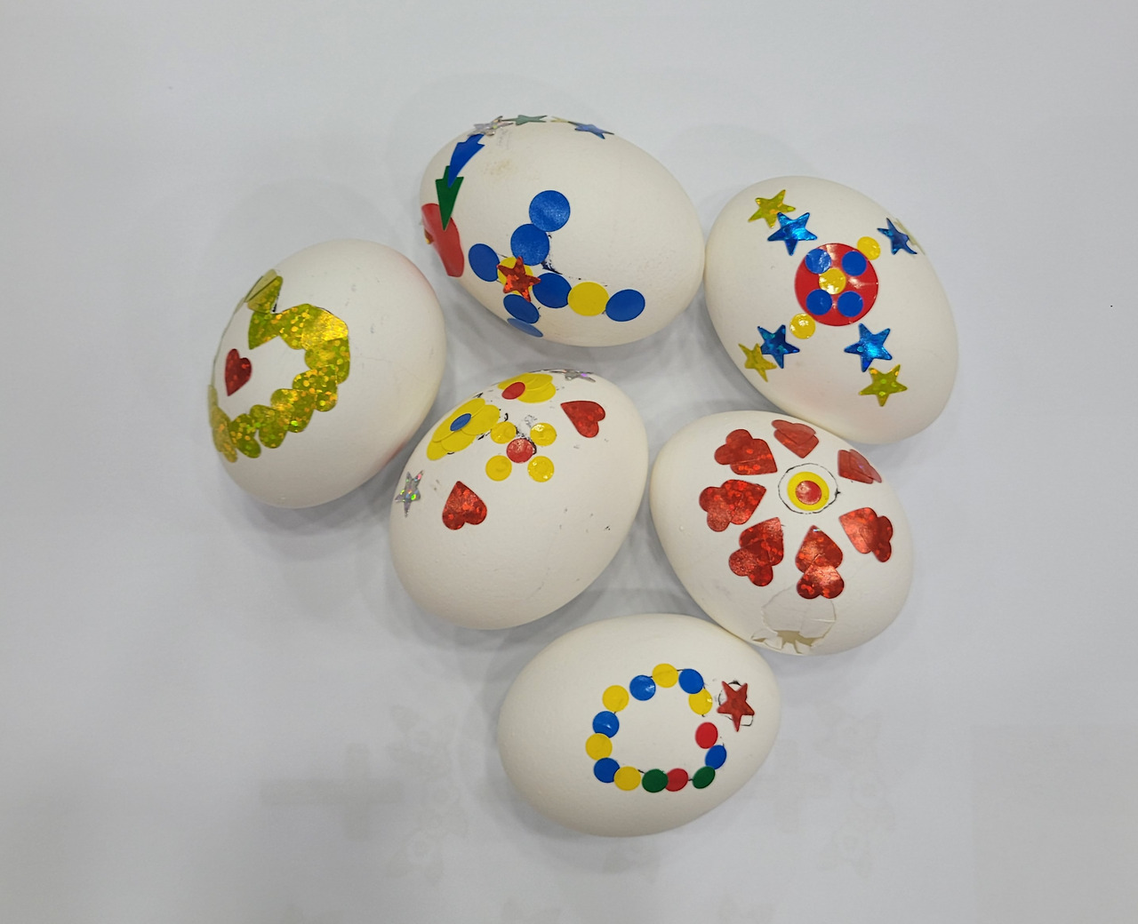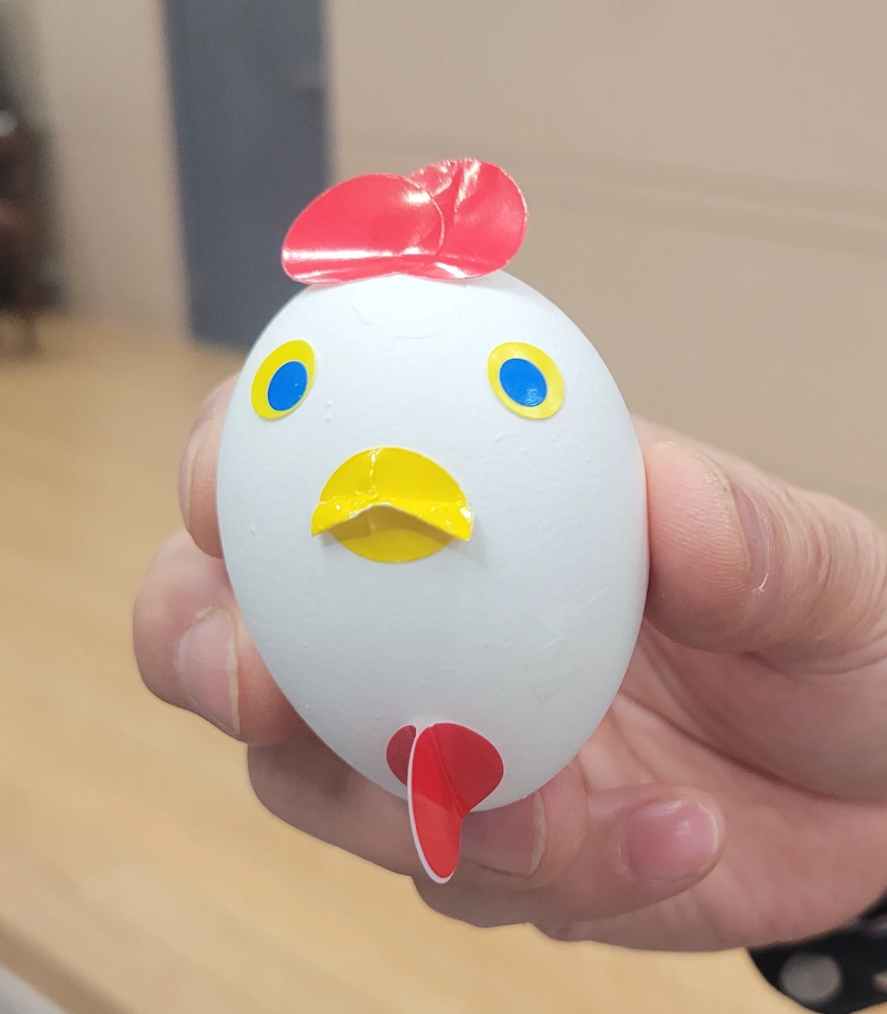 어떤 사람은 그저 스티커를 무한정 붙이기만 했다. 그런데 이 분은 스티커를 절반으로 붙인 후 끝 부분을 반으로 갈라 달걀에 붙였다. 그랬더니 병아리의 코와 입이 되었다.