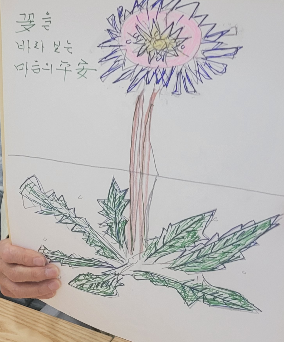 이를 안타깝게 여긴 딸은 엄마의 손을 같이 붙잡고 두 손이 같이 민들레 그림을 그리는 것이다. 그러니 완전 초집중 모드다. 손이 있어도 다리가 활발히 움직여도 난 그림에 재능이 없다고 그림을 안 그리겠다는 어르신도 있었다.