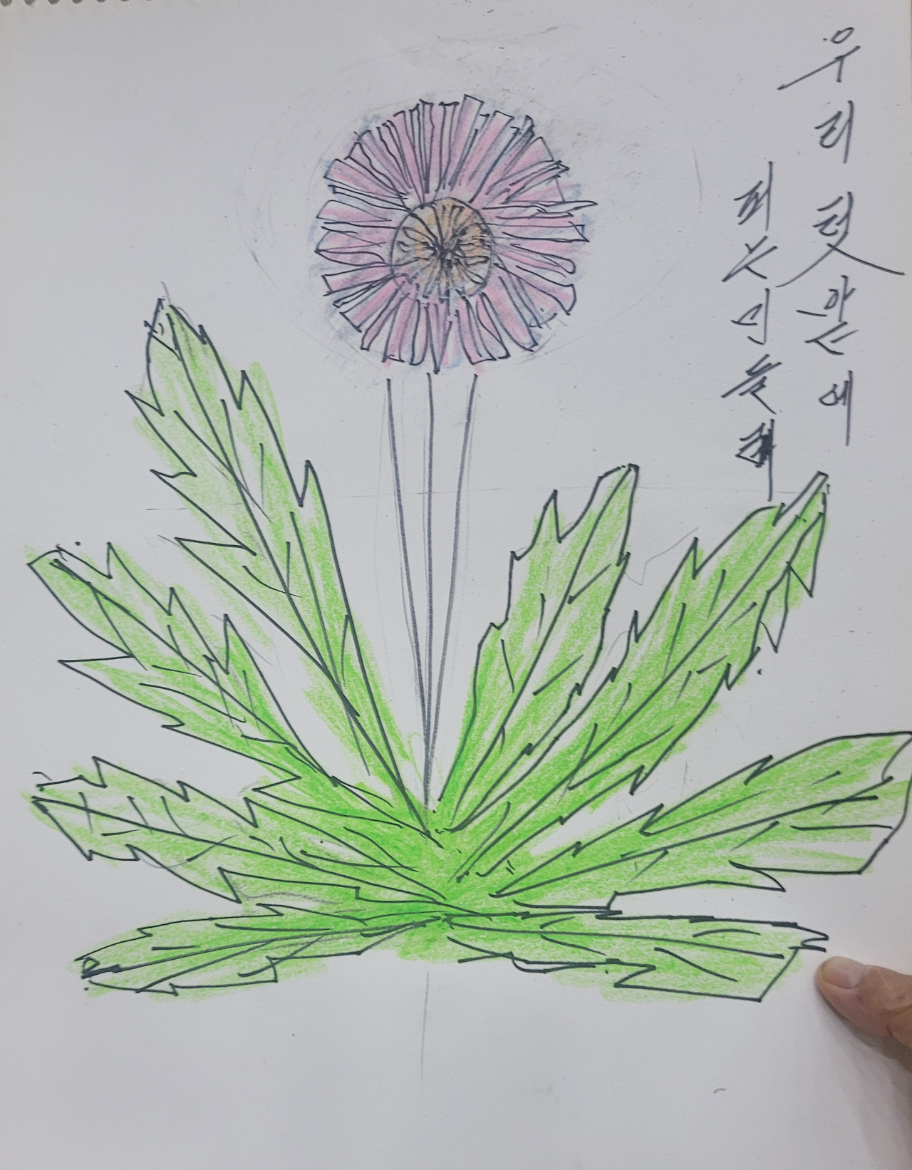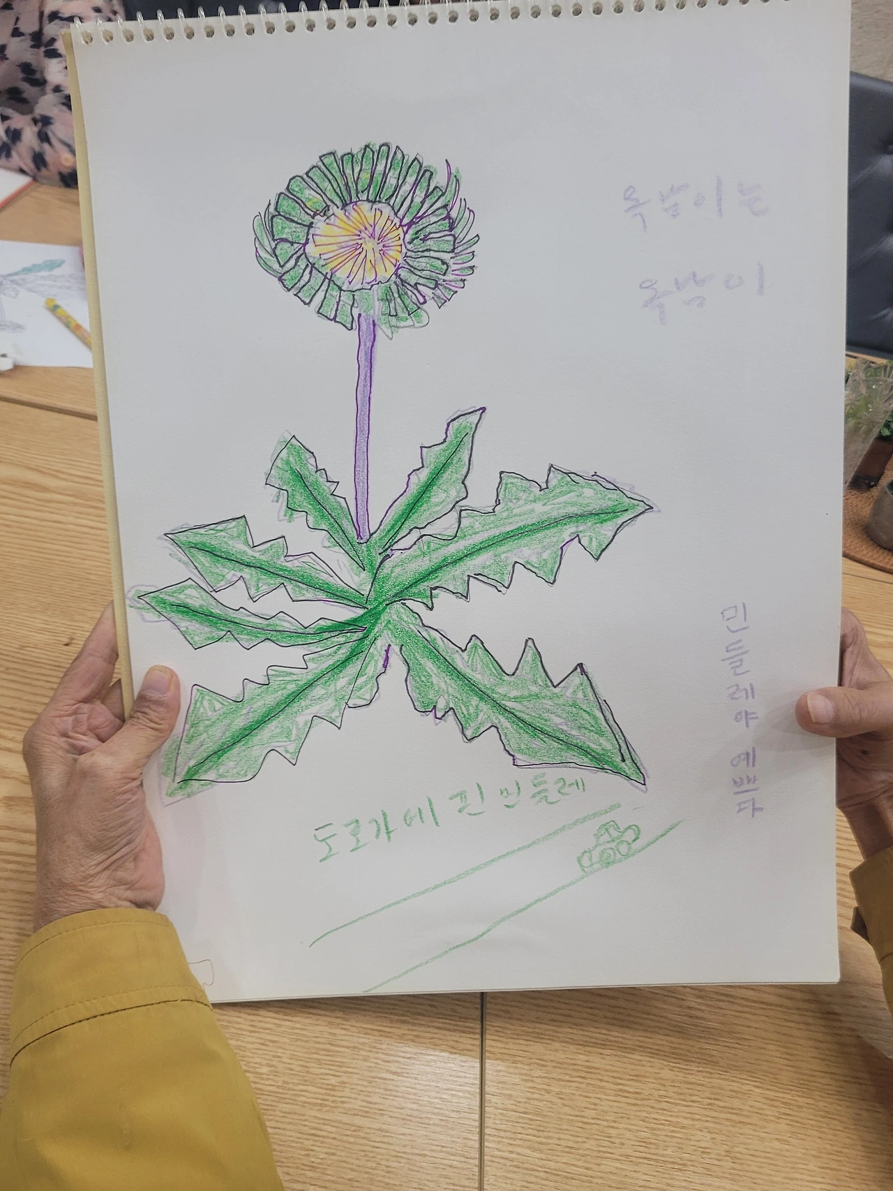 내가 그린 민들레는 노란 털도 있고 초록 줄기도 있다. 그런데 실버 어르신들의 민들레는 머리가 다 사라졌고 줄기도 제각각 뭐라고 표현해야 맞을까? 젊은 시절이 다 사라진 어쩌면 쪼그라들고 힘도 없는 선들은 불규칙했고 색도 젊음의 색이 아닌 보라색, 어떤 색은 검은색 등도 있었다.