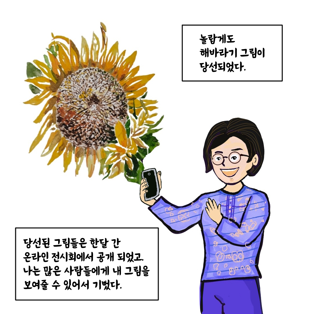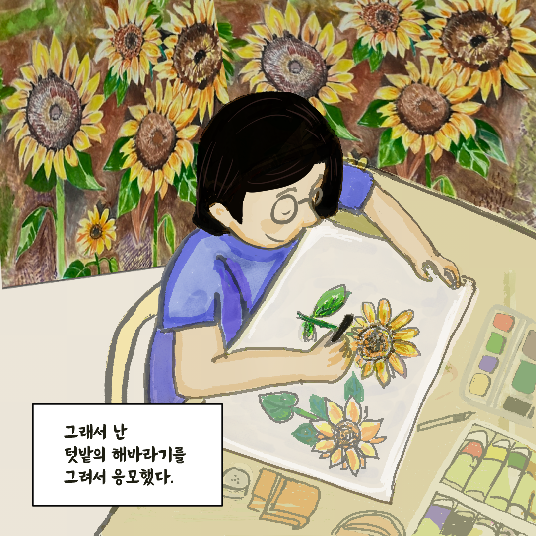 해바라기를 보자 난 그림을 그려 보고 싶은 마음이 들었다. 그림을 그려 모 방송국에 올렸더니 놀랍게도 상을 받게 되었다. 그 뒤 난 해마다 해바라기를 가꾸고 심고 그림을 그렸다. 그림을 그리고 나니 사람들이 해바라기 그림을 보고 자꾸 달라는 신호를 보냈다.