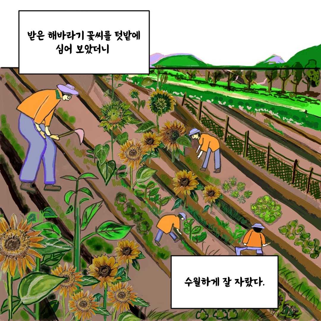 우연히 해바라기 씨앗을 얻었다. 나는 꽃씨 약국에서 받은 씨앗을 아파트 근처 임대 텃밭에 심어 보았다. 텃밭엔 가지와 고추, 상추 등 작은 모종도 함께 심었다. 처음 해 본 텃밭 일은 무척 보람되고 감사한 일이었다. 모종을 심은 후 고추와 가지가 자라자 묘한 쾌감이 들었다. 이보다 더 기쁜 일은 해바라기가 내 키보다 더 크게 해를 향해 우뚝 서서 자란 일이었다.