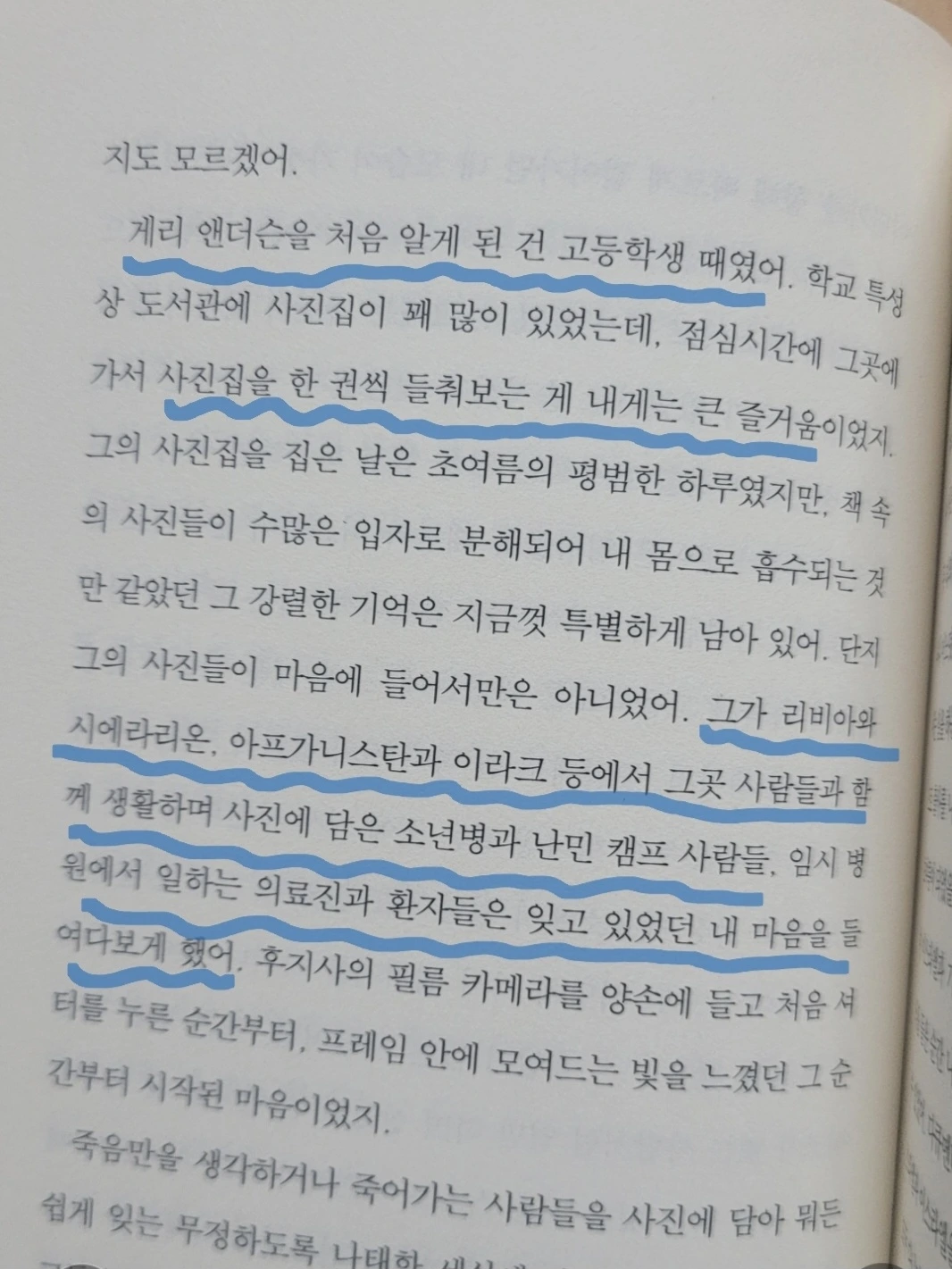 이 글에는 여러 장의 기록들이 마치 영화처럼 사진과 기록으로 남아있다. 많은 기록과 사진을 찍는 피디와 기자들 그리고 구호단체 소속의 활동가들의 기록을 통해 글은 지구촌 곳곳의 전쟁의 심각함을 예보했다. 게리 앤더슨의 십 주기 추모 전시라는 게리가 분쟁 지역에서 찍은 사진이라는 말, 그리고 그가 사진에 대해 남긴 메모들을 보자 마음이 더 복잡해졌다.
