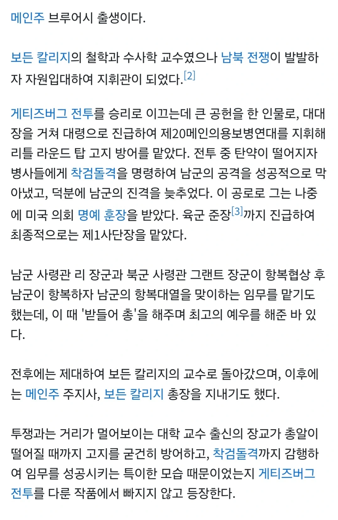 남군은 포트 섬터 장악. 체임벌린 대령이 남북전쟁의 불리한 흐름을 바꾼 사람.