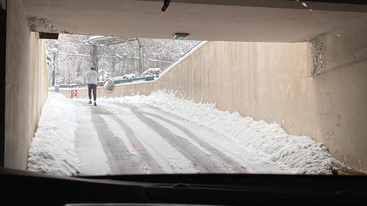 주차장부터 이렇게 미끄럽다면 집에 가는 길은 얼마나 더 위험할까.