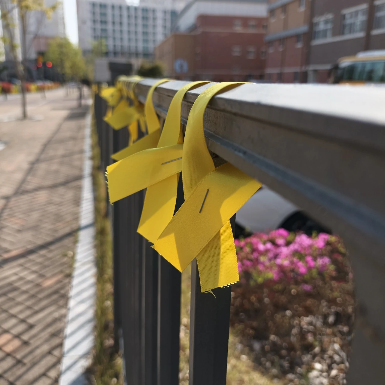 안산에서 먼 우리동네 중학교. 2014년엔 네다섯 살이었을 이 학교 친구들이 노란 리본 수백개를 학교 담장에 달았대.