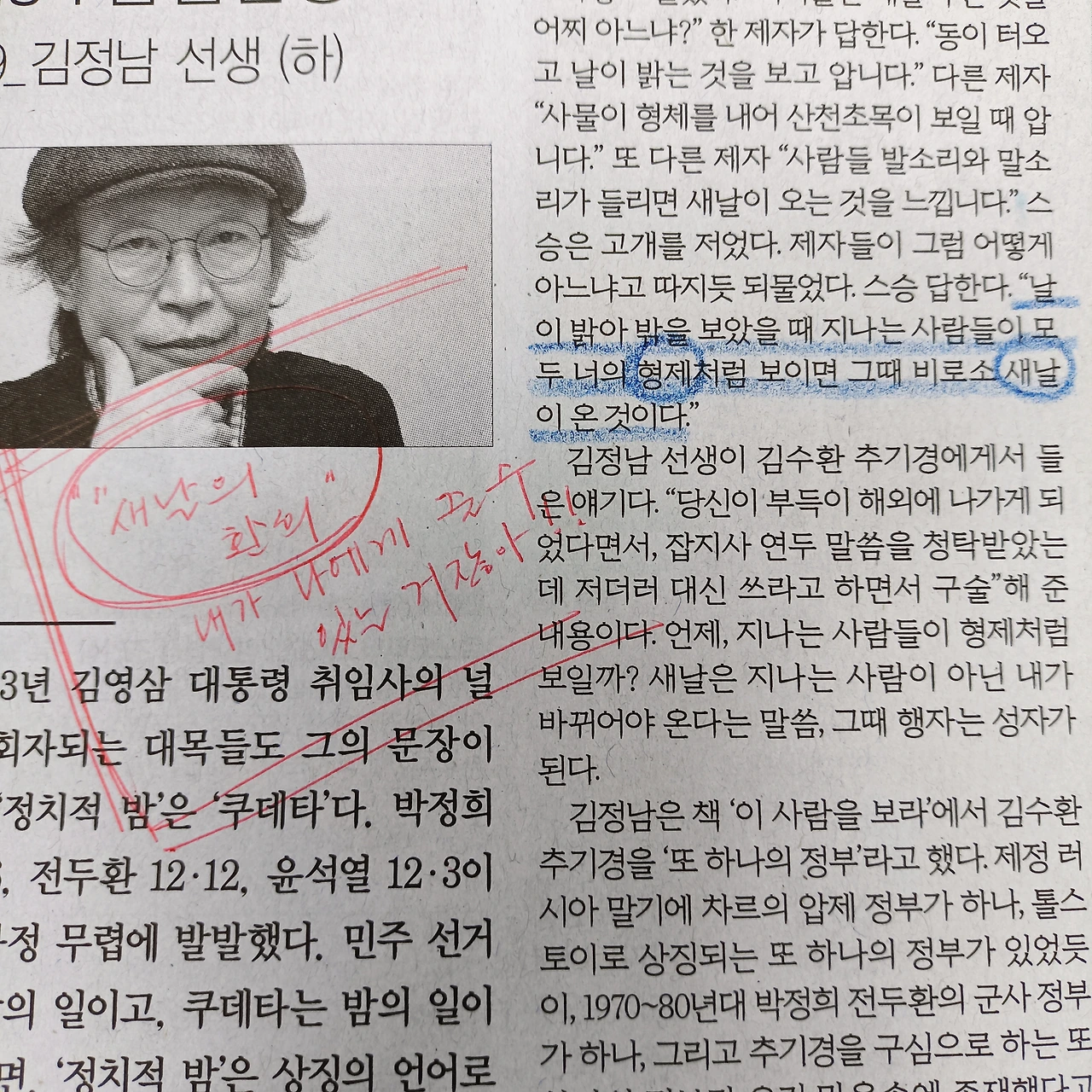 저는 체계적으로 메모를 기록하는 편도 아니고 습관이나 유희로 낙서를 즐기는 편도 아닙니다만 신문을 읽을 땐 꼭 색연필이나 펜 한 자루를 손에 들고 시작합니다. 새로 알게 된 사실이나 기억해 두었다 인용하고 싶은 문장에 밑줄을 긋고 몇 자 적어보기도 하거든요. 그렇게 하면 눈으로만 읽어내려갈 때보다 머릿속에 각인이 잘 되는 것 같아 만족스럽습니다.