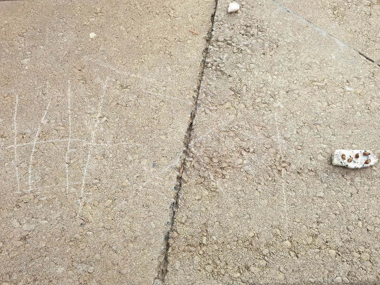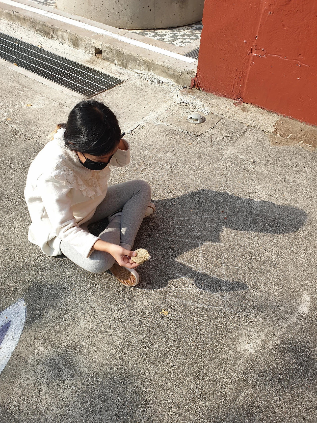 적당한 날씨, 짧고 소박한 나들이 하나에도 아이는 예상하지 못한 곳에서 즐거움을 찾는다. 가위팔방을 하기 위해 아빠가 풀밭에서 주워 준 하얀 돌은 석필처럼 시멘트 바닥에 낙서하기에 좋았다. 신기했던 아이는 바닥에 되는대로 앉아 그림도 그리고 글씨도 써본다.