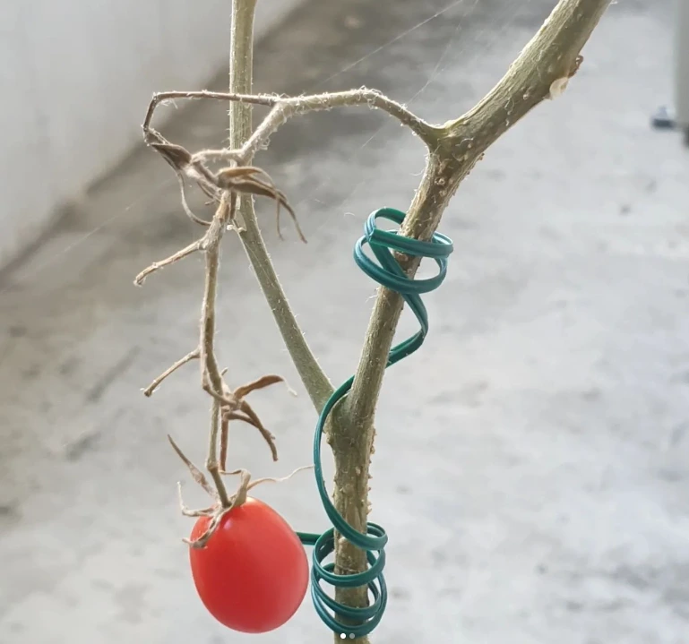 상태가 좋지 않은데도, 온 힘을 다해 열매를 맺었지만 더 이상은 무리가 될 것 같아 나는 줄기째로 잘라와서 물에 꽂아두었다. 초록의 그 상태 자체로도 예뻤다. 신기하게도 토마토가 후에 빨갛게 익는 것이었다. 나머지 하나는 새가 먹으라고 두었지만 새는 토마토를 먹지 않는지 떨어져 굴러다니고 있다.