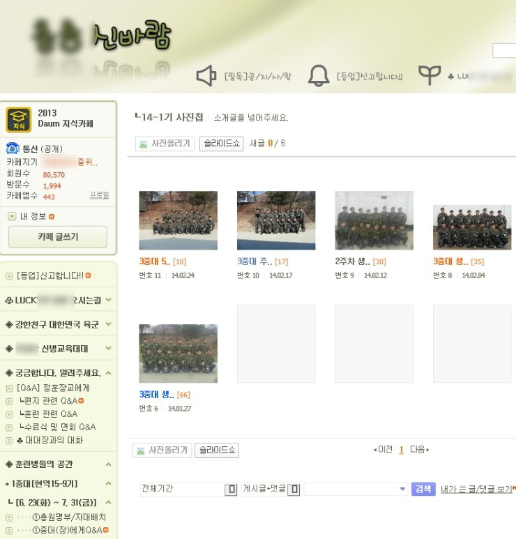 아버님이 보시는 앞에 다음카페의 아들 소속중대 게시판으로 들어갑니다. 많은 아들들의 사진이 주욱주욱 나옵니다.