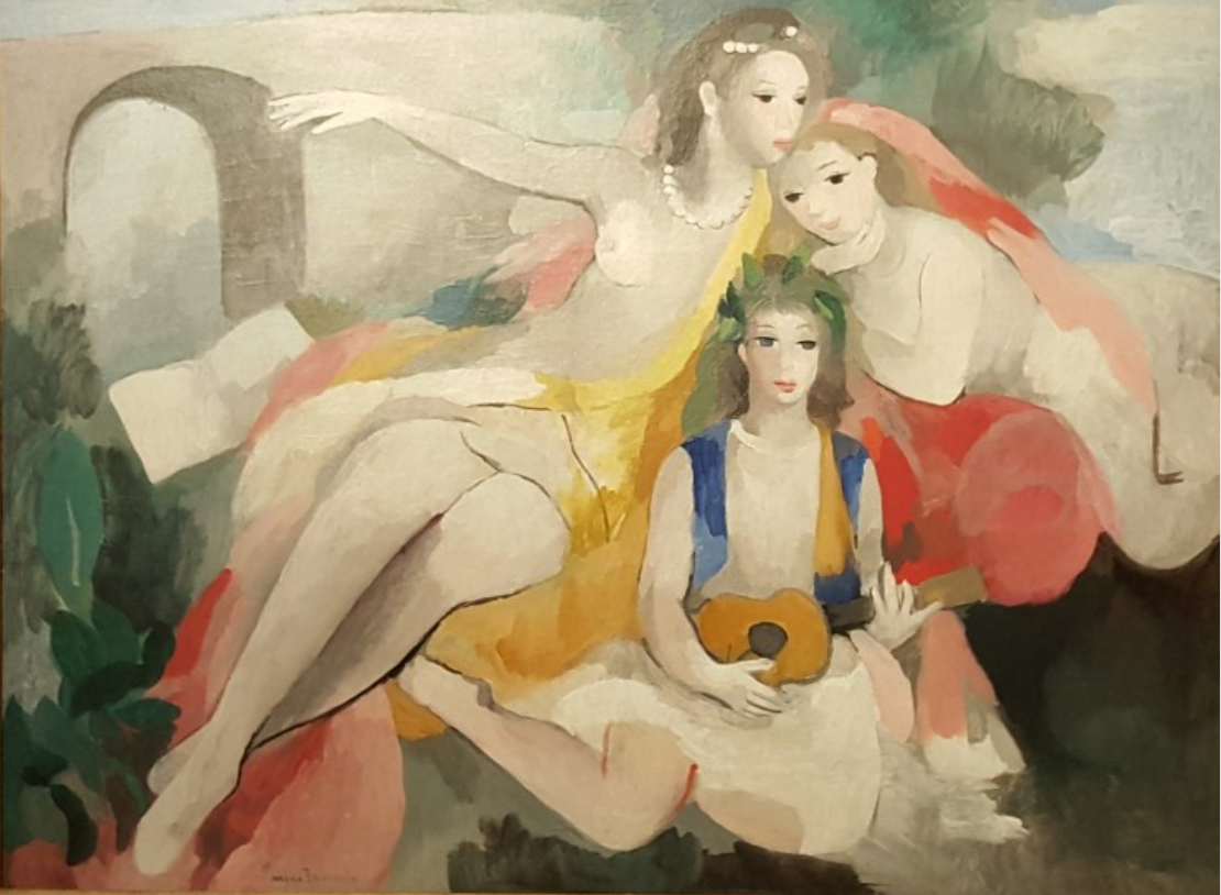망명 시대에 그렸던 작품인데, 소재는 왠지 모르게 시대에 걸맞지 않다. 작가는 이와 같은 그림을 그리며 고국으로 돌아갈 수 있을 것이라는 믿음과 희망을 품었던 것 같다. 위 작품에서 마리 로랑생은 왼쪽에서 두 번째 여인이다. 사랑했던 아폴리네르를 상징하는 기타를 들고 있으며, 그녀가 애정했던 격자무늬의 스카프를 착용하고 있다. 그녀 옆의 핑크빛 원피스를 입은 여인은 망명 시대에 그녀에게 프랑스 소식을 들려줬던 절친한 친구이다. 핑크를 통해 희망을 드러냈던 마리 로랑생의 애정이 듬뿍 담긴 여인상이다.