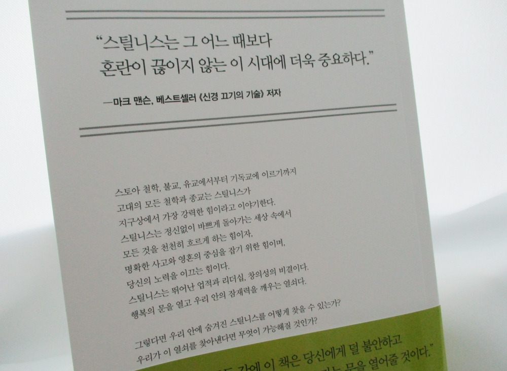 2012년, 마크 네포(Maek Nepo)의 《고요함이 들려주는 것들》을 읽고 깊은 감명을 받았던 나는 《스틸니스》를 접하면서 동일한 감정에 휩싸였다. 두 책 모두 흐름출판사에서 펴냈는데, 고요함의 힘을 강조하는 점이 비슷하다.