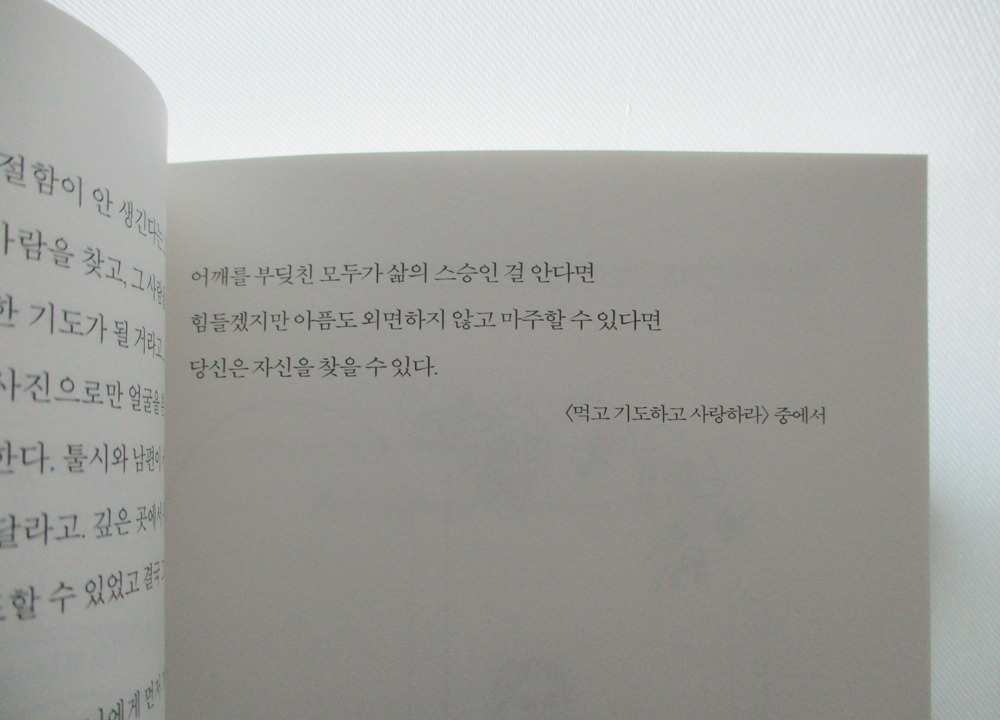 '내가 사람 만나는 것이 두렵다고 하자 아저씨는 사랑하는 것을 두려워하지 말라고 하셨다. 사랑하며 사는 것이 인생의 큰 부분이라고... 영화 <먹고 기도하고 사랑하라>(라이언 머피 감독)의 케투 아저씨가 생각났다. (…) 버니 아저씨는 남은 인생이 사랑만 하기에도 부족하다고 말했다. - p. 37