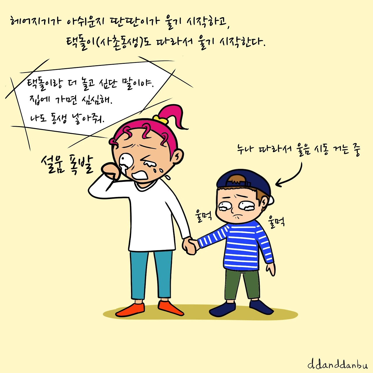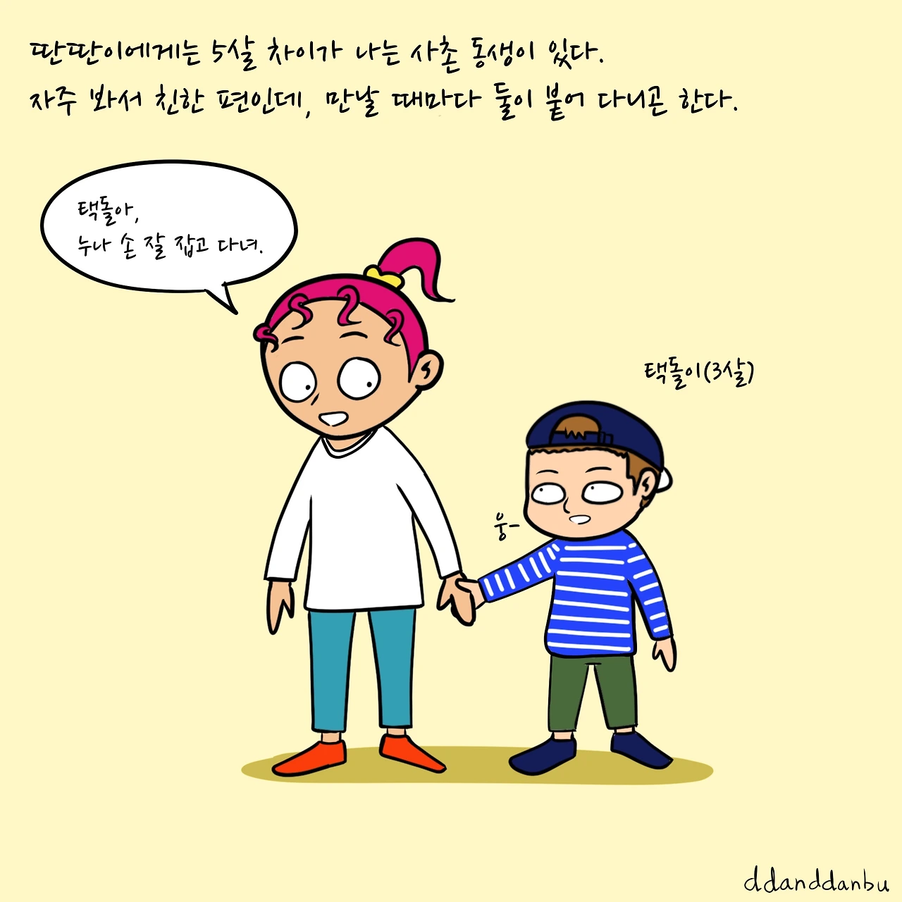 둘이 나이 차이도 많이 나고 말도 안 통해서같이 안 놀 줄 알았지만, 사이가 엄청 좋아요.동생이 없는 딴딴이는 택돌이가 너무 귀여운 것 같고, 택돌이는 잘 돌봐주는 누나를 잘 따르는 것 같아요.여러 사정으로 동생을 낳아 주기 힘든데,딴딴이가 사촌 동생을 잘 돌봐주고 외로워 하는 걸 보면 마음이 많이 아프더라고요.