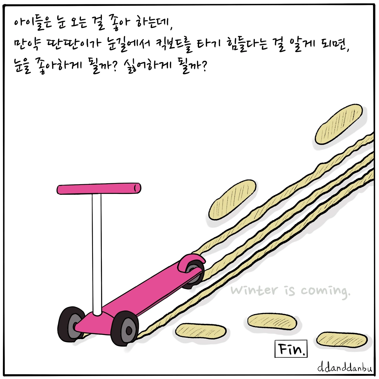 어른이 된 이후로 눈을 좋아해 본 적이 없는 것 같네요. 차 막힐까봐 걱정, 눈길에 미끌어질까봐 걱정, 옷이 더러워질까봐 걱정, 눈 치울 걱정에 눈을 좋아하기란 쉽지 않죠. 딴딴이는 그런 걱정 없이 눈을 좋아 했으면 좋겠네요.^^