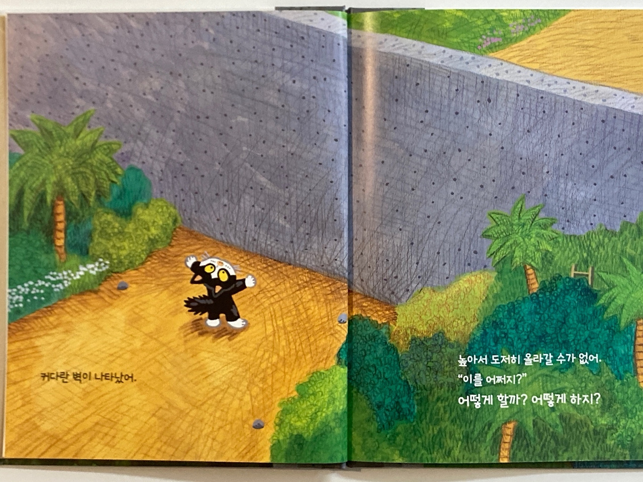 '커다란 벽이 있다면?'이라는 책은 이런 우리의 삶의 모습을 표현한 책입니다. 고양이 한 마리가 커다란 벽이 마주하고는 깜짝 놀랍니다. 하지만 이내 해결방법을 생각해 내고 벽을 넘습니다. '벽을 넘었다!' 하고 안심했는데 이제는 조금 더 높은 또 다른 벽이 기다리고 있습니다. 그리고 언제나 벽 앞에서 당황스럽지만 포기하지 않고 용기를 내서 다시 한번 해결합니다.