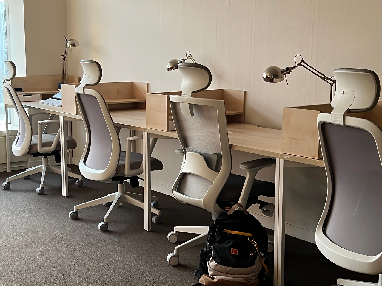 - 개별 작업 데스크 및 의자(시디즈, 데스커 제품), 개인 서랍이 준비된 고정석