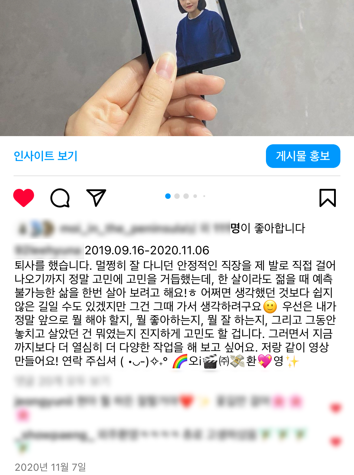 업로드할 사진은 뭘로 고르고, 워딩은 뭐라고 써야 사람들이 잠시라도 스크롤을 멈춰서 내 글에 주목해줄지 고민했다. 다행히 나는 인스타 피드에 무언갈 화려하게 자주 올리는 사람은 아니었지만 영화과 동문들, 직장동료들과 꼬박꼬박 맞팔을 해왔기 때문에 내 인스타 속 인맥풀(?)은 나름 풍부한 편이었다.