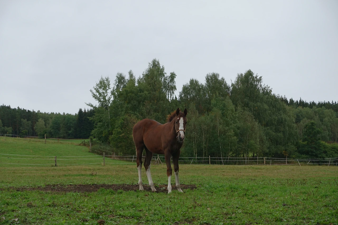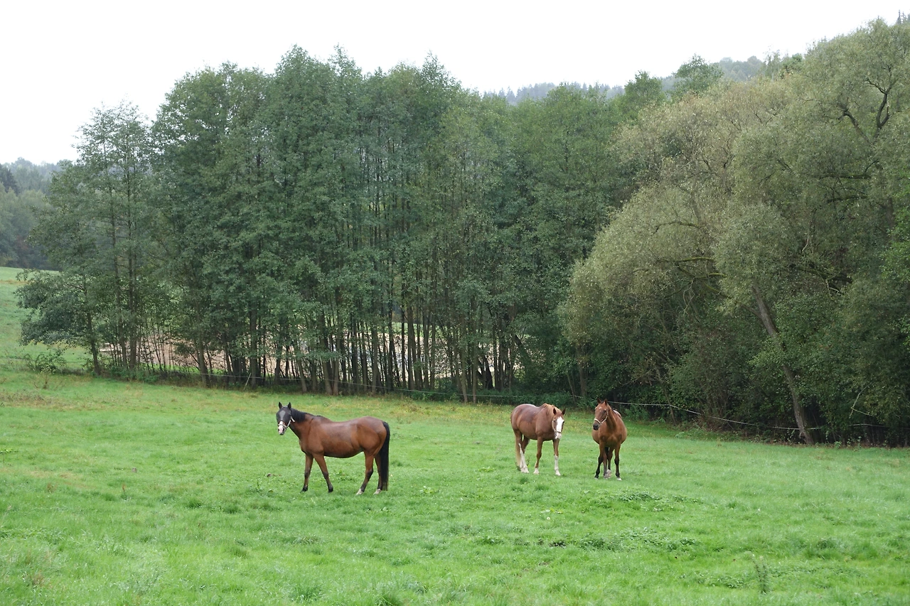 내가 갔던 체코 시골 농장은 야트막한 구릉과 푸르른 초지로 되어 있었다. 이때는 제주도 외승도 가본 적도 없어서 더더욱 이러한 풍경에 적지 않은 충격을 받았다. 당시에는 휴대폰이나 사진기를 들고 타지 않았고 (들고 탈 여유도 없었고) 내려와서 말 방목지를 찍었는데, 사진으로는 어느 오름 초지 같기도. 그래도 말을 타고 다니면서 동네 사슴 떼가 도망치는 것을 보았다. 자연!