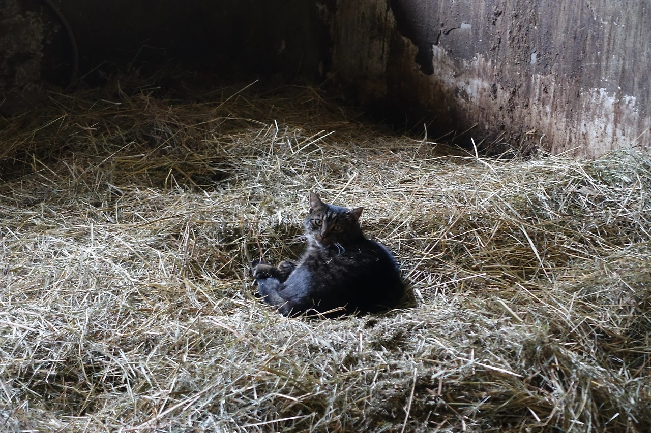 더러브렛한테서는 본 적 없는 신기한 점박이 무늬가 있는 말도 있었고 (더러브렛도 아랍종과 뭐들이 섞인 종인데 조상 중에 점박이는 없는지 모르겠다), 건초 더미에 파묻혀 푹신하게 쉬고 있는 고양이들도 있었다.