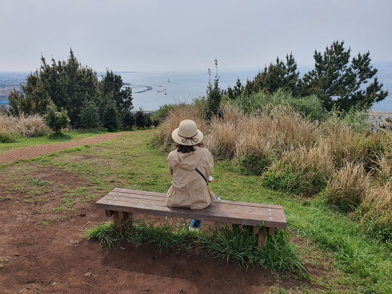 정상에 오르면 체육시설과 휴게시설이 잘 갖춰져 있고, 팔각정 형태의 망양각(望洋閣)이 있어 360도 파노라마 뷰를 만끽할 수 있었다. 좌측으로는 제주시 중심부를 한눈에 내려다 보였고, 정면과 우측으로는 가슴 뻥 뚫리는 제주항 오션뷰를 내려다볼 수 있었다. 망양점에 앉으면 겹겹이 흰색의 원피스를 입은 벚꽃과 고집스럽게 한 가지 봄옷만 입는 초록의 소나무가 한데 어우러져 사라봉만의 이색적인 아름다움을 자아냈다.