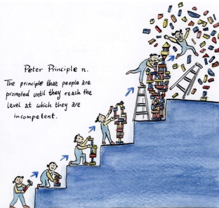 이를 다른 말로 하면 조직의 상층부는 결국 무능한 사람으로 채워지게 된다는 '피터의 법칙(Peter Principle)과도 유사한 개념입니다. 캐나다 태생의 미국 교육학자 로렌스 피터와 레이먼트 헐은 1969년 《피터의 법칙, Peter Principle : Why Things Always Go Wrong?》이란 책에서 "수직적인 계층 조직 내에서는 모든 직원이 경쟁력 없는 직책으로 승진하는 경향이 있으며, 다수의 직책이 그 역할에 맞지 않는 직원들로 채워지는 경향이 있다. 결과적으로 직무수행 능력이 부족한 직원들이 그와 맞지 않는 직책을 담당하게 된다"라고 말하면서 책 제목처럼 "왜 일은 늘 잘못되어 가는 걸까?"라는 뜻의 의미를 재차 강조했습니다.
