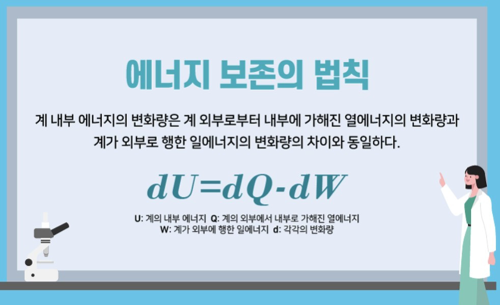 열역학 제1법칙은 '에너지 보존 법칙(law of enegry conservation)'이라고 부릅니다. 에너지가 다른 에너지로 전환될 때 전환 전후의 에너지 총합은 항상 일정하게 보존된다는 법칙입니다. 에너지는 형태는 변하더라도 총량은 변하지 않는다는 뜻이죠. 에너지는 형태만 바뀔 뿐 소멸하거나 새롭게 형성되지 않는 것을 의미입니다.