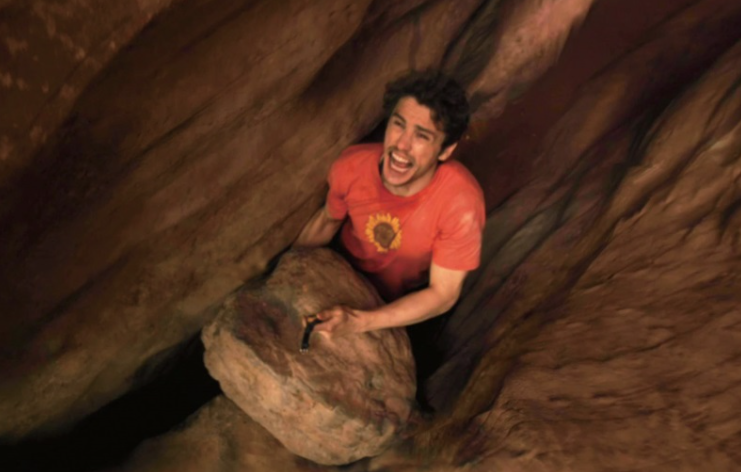 하지만 그는 절대 포기하지 않습니다. 급기야 그는 자신의 팔을 절단해서 탈출하기로 결심을 하고, 들고 있던 소형 나이프로 팔을 자르고 나중에는 팔을 부러뜨려 극적으로 그곳을 빠져나오게 됩니다. 그 장면은 차마 눈을 뜨고 볼 수 없을 정도로 경악스러웠습니다. 영화 포스터에는 이런 말이 나옵니다.